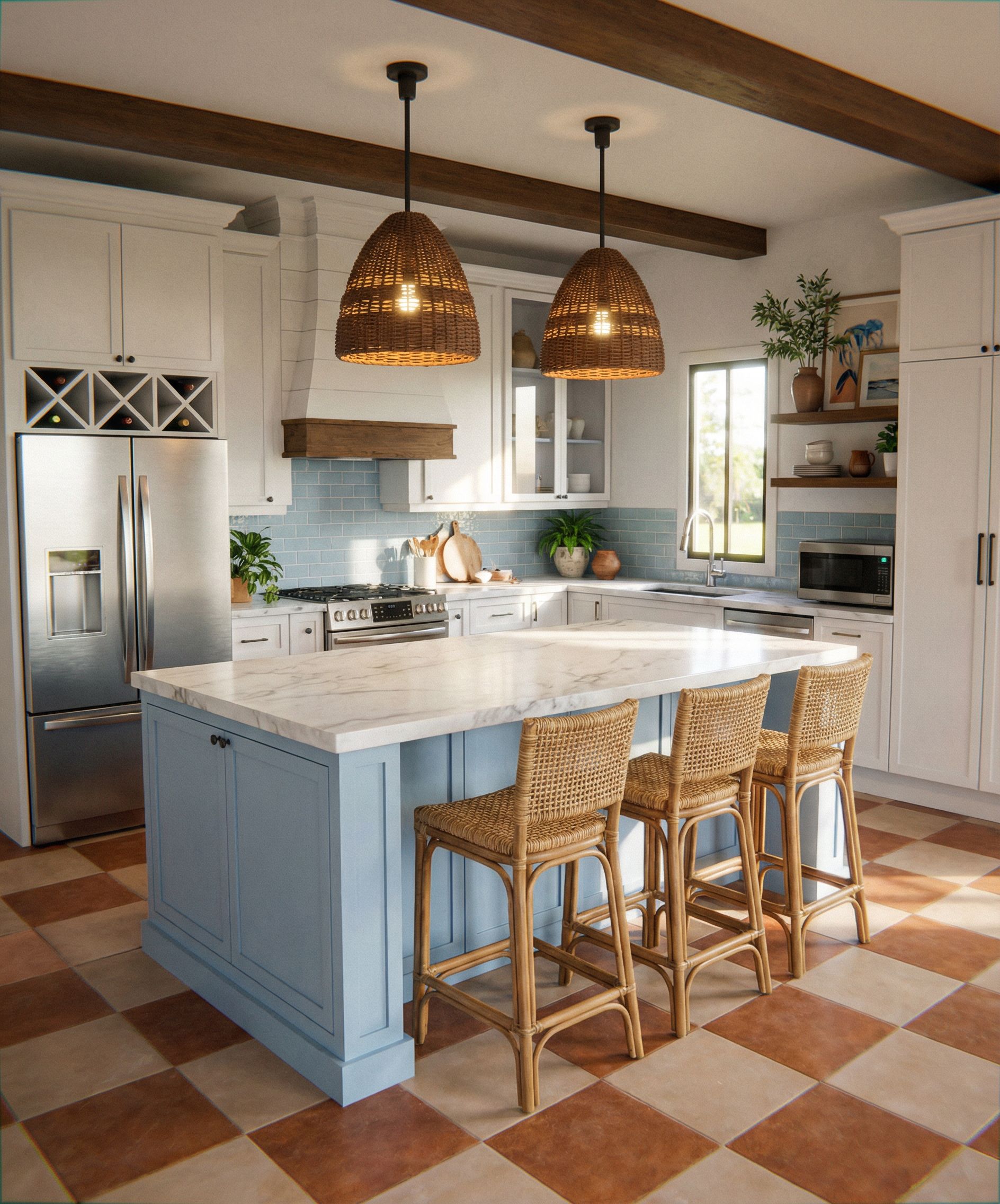 PromptPhoto of a contemporary kitchen featuring a central island with blue cabinetry, sleek countertops, and stylish wooden accents. The design includes black woven pendant lights, stainless steel appliances, and a tile backsplash in soft blue tones. Set in a modern home environment with earthy flooring and wooden beams overhead, the lighting is natural, illuminating the space during the day. Captured from a slightly elevated angle to emphasize the layout and design intricacies, using a wide-angle lens to enhance depth and perspective. Brown Woven basket ceiling lights, Super bright, full sun room, keep exact camera angle