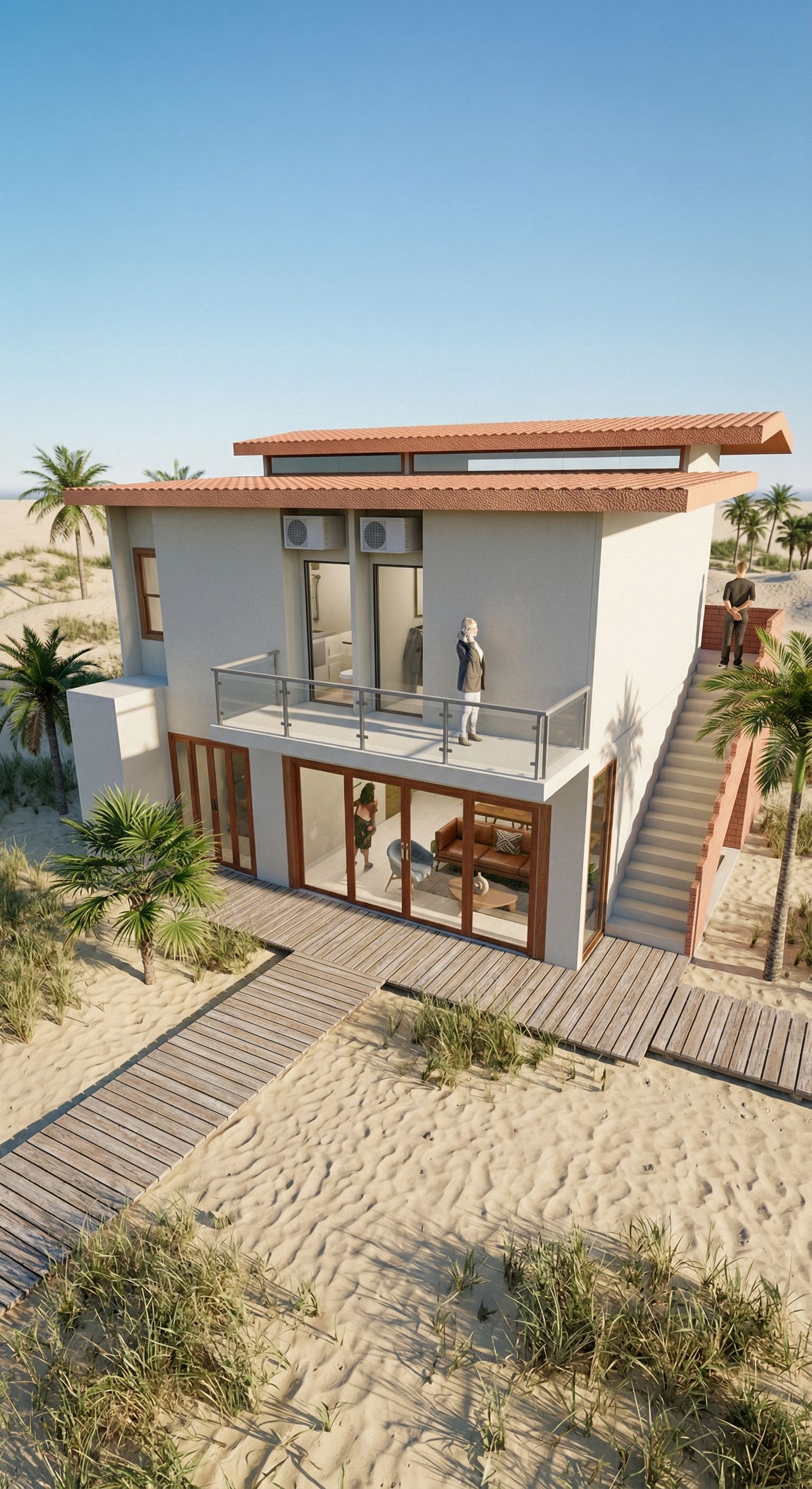Promptthis haouse is on the beach so put some sand and palms but dont put the ocean, and dont change anithign just make it realistic , keep exact camera angle