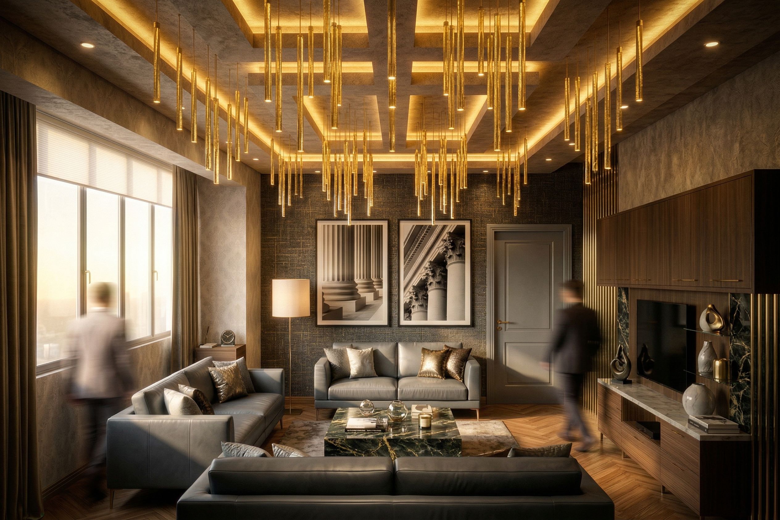 mantén la misma arquitectura del espacio y los techos y añade a esta imagen del salón una fuerte influencia moderna como la que está en la imagen de referencia., keep exact camera angle