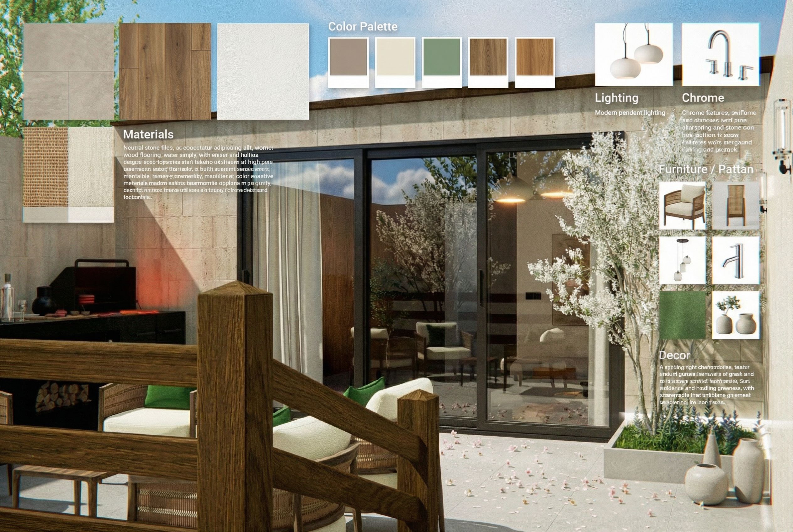 PromptUsing the attached image of the bathroom, create a detailed mood board highlighting the design style. Extract the color palette, materials, furniture, lighting, tiles, and decorative elements. Emphasize the overall atmosphere—whether spa-like, modern, luxurious, or minimal—and ensure all suggestions harmonize with the original bathroom design. Present the mood board in a visually organized layout for easy reference.”, keep exact camera angle