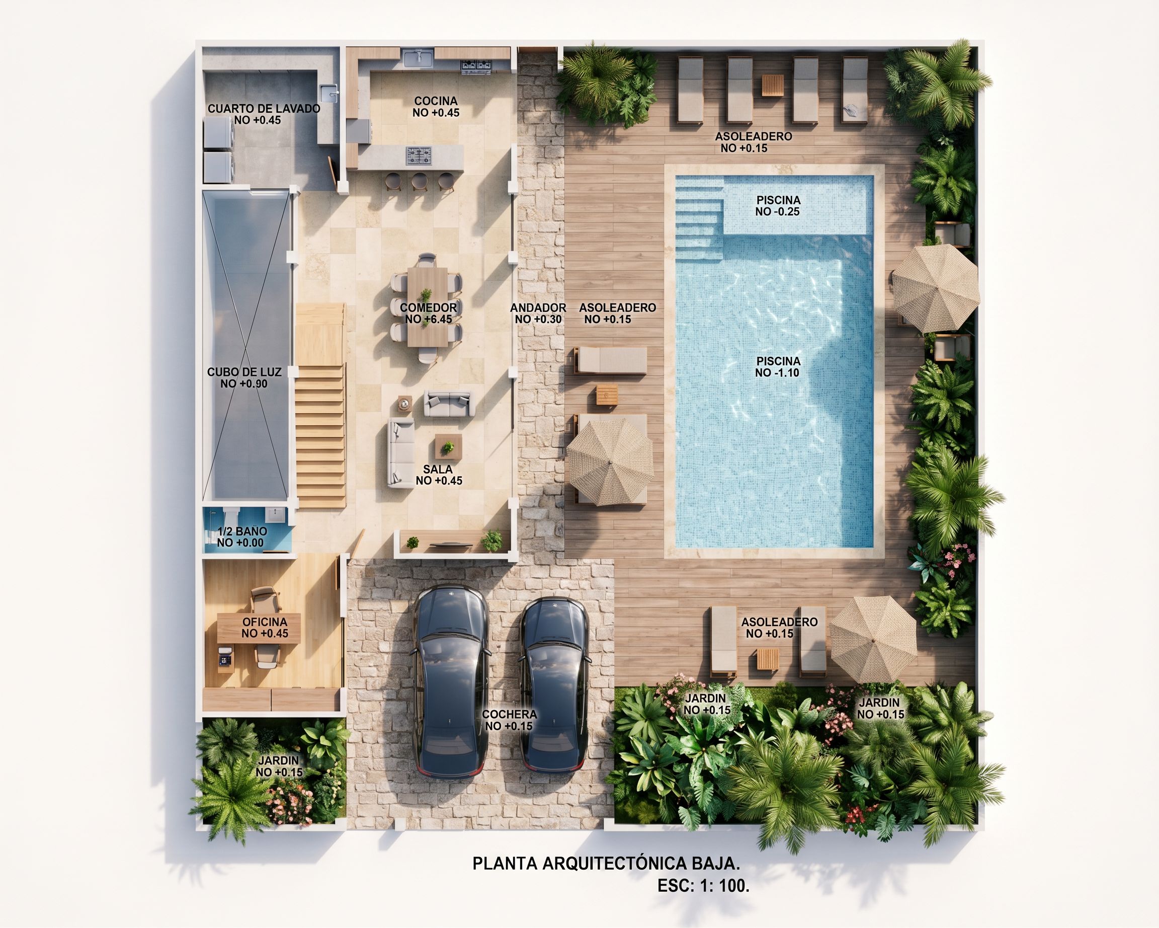 PLANTA ARQUITECTONICA BAJA, COCHERA Y ANDADORES CON PISOS DE PIEDRA, ALREDEDOR DE PISCINA CON PISOS DE LOSETA IMITACION MADERA, INTERIOR DE PISCINA CON AZULEJOS EN COLOR AZUL CLARO, OFICINA CON PISO DE MADERA CLARA, BAÑOS CON PISO DE AZULEJO EN COLOR AZUL, ESCALERA EN MADERA, SALA,COMEDOR Y COCINA CON PISO DE LOSETA COLOR BEIGE, CUARTO DE LAVADO CON PISOS DE LOSETA EN COLOR GRIS, ABUNDANTE VEGETACION Y RESPETAR LIMITES DE CROQUIS., keep exact camera angle