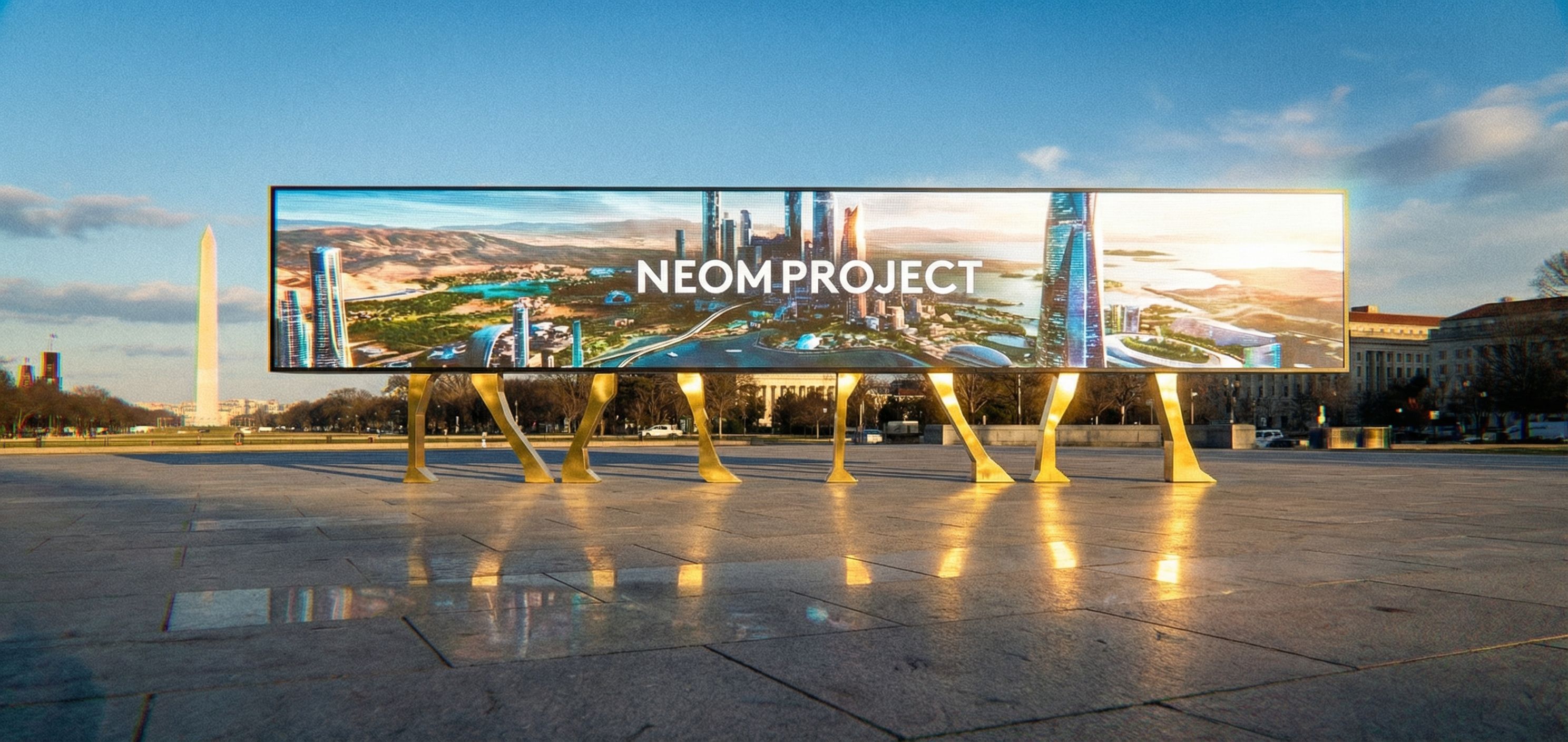 keep exact camera angle , BLACK IS SCREEN , YELLOW IS GOLD CLADDING , , Washington DC , PUT NEOM PROJECT ON SCREEN,, keep exact camera angle