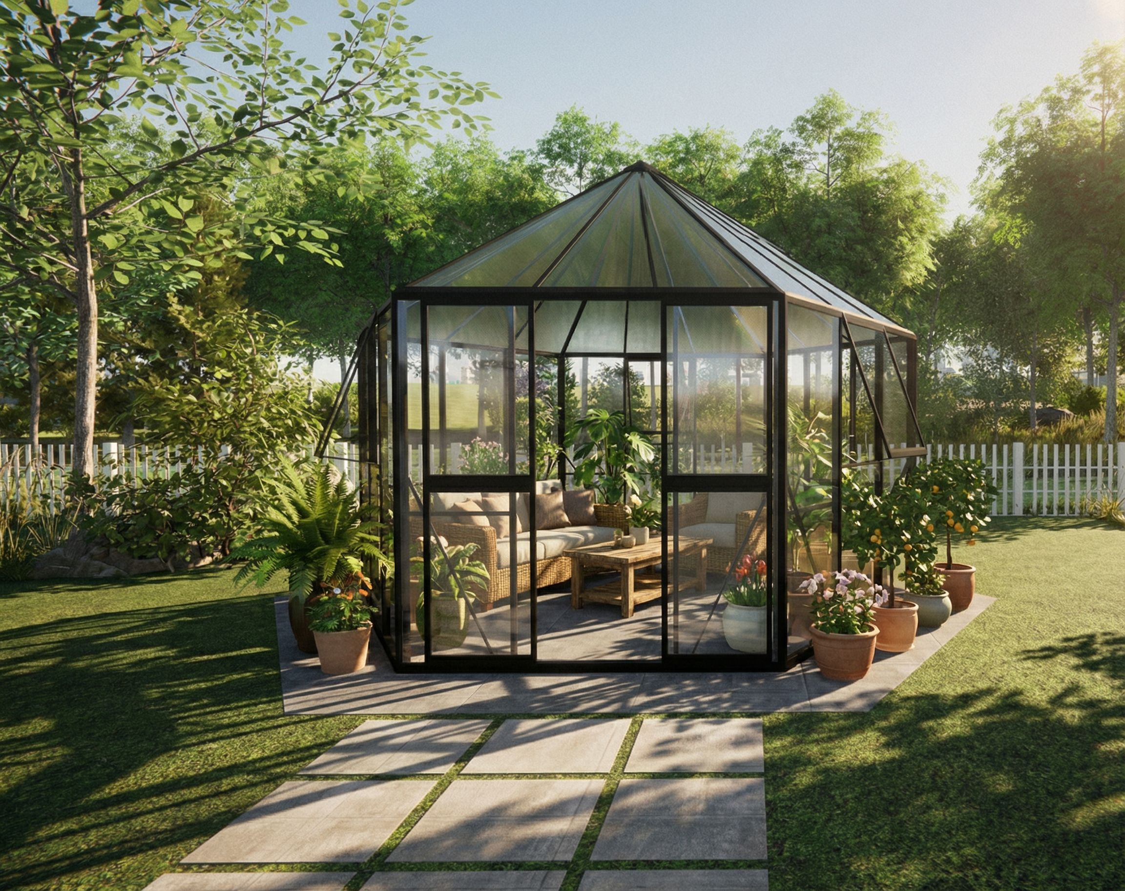 PromptMake more realistic. better lighting and shadows and plants. Change furniture and plants inside, keep exact camera angle