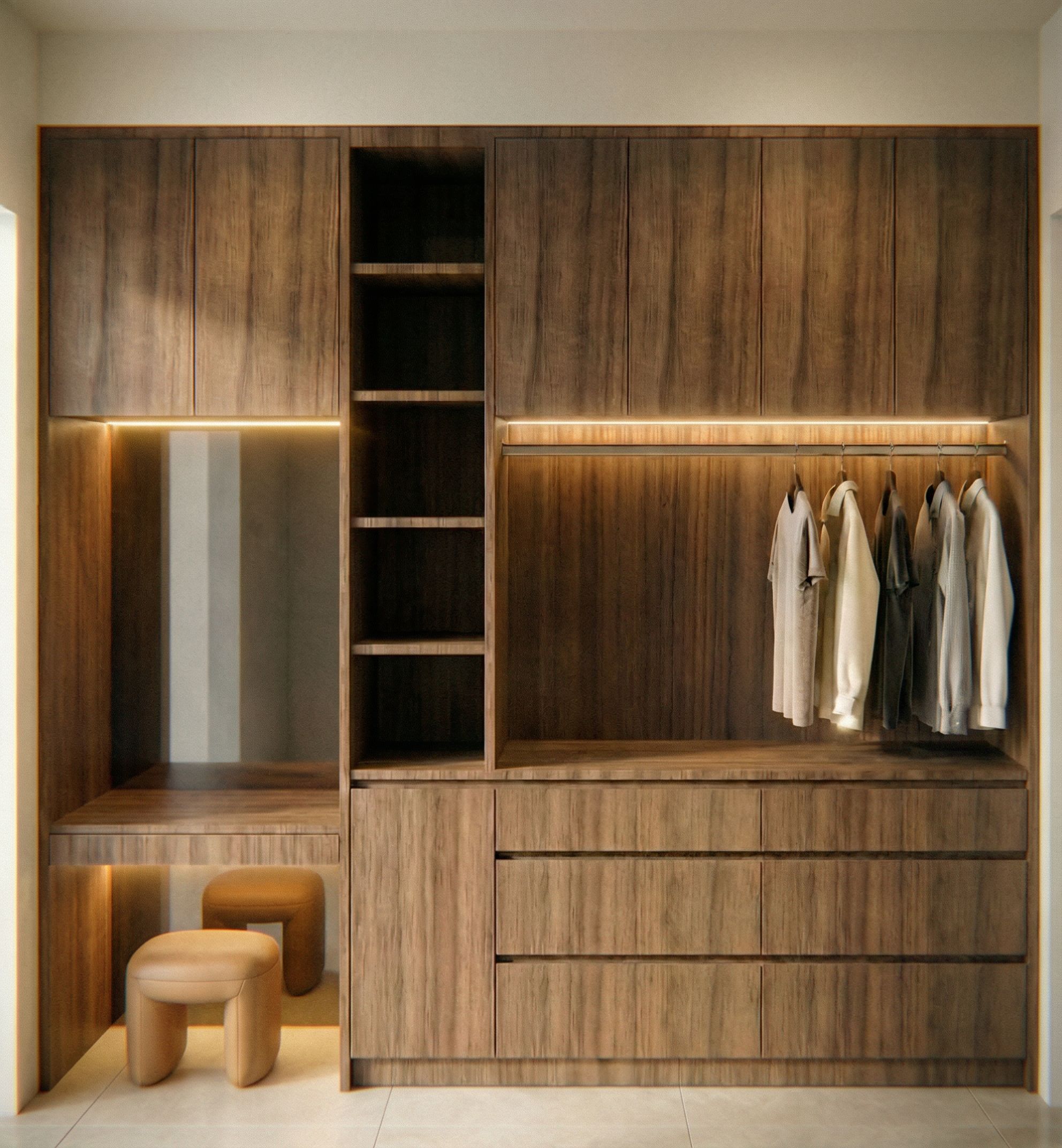 PromptAdd strip lighting to under side of desk and underside of upper cabinet above desk, keep exact camera angle