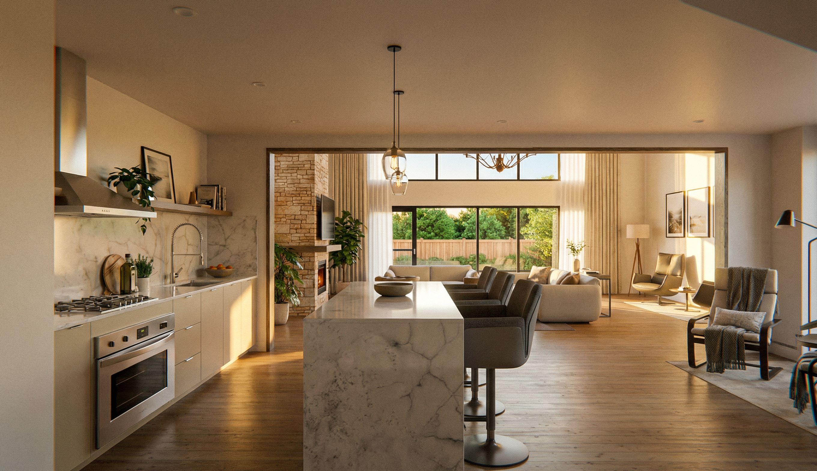 PromptAn open-plan interior features a modern kitchen island with white marble countertops and a kitchen area with light beige cabinets, a stainless steel range hood, and a marble backsplash. The space transitions into a living area with comfortable seating, including a light-colored sofa and various armchairs, situated on a warm wooden floor. There's a prominent coral stone wall with a fireplace, adjacent to a large black-framed glass window overlooking lush green trees and a fence. The interior is brightly illuminated by natural daylight under a clear sky., keep exact camera angle
