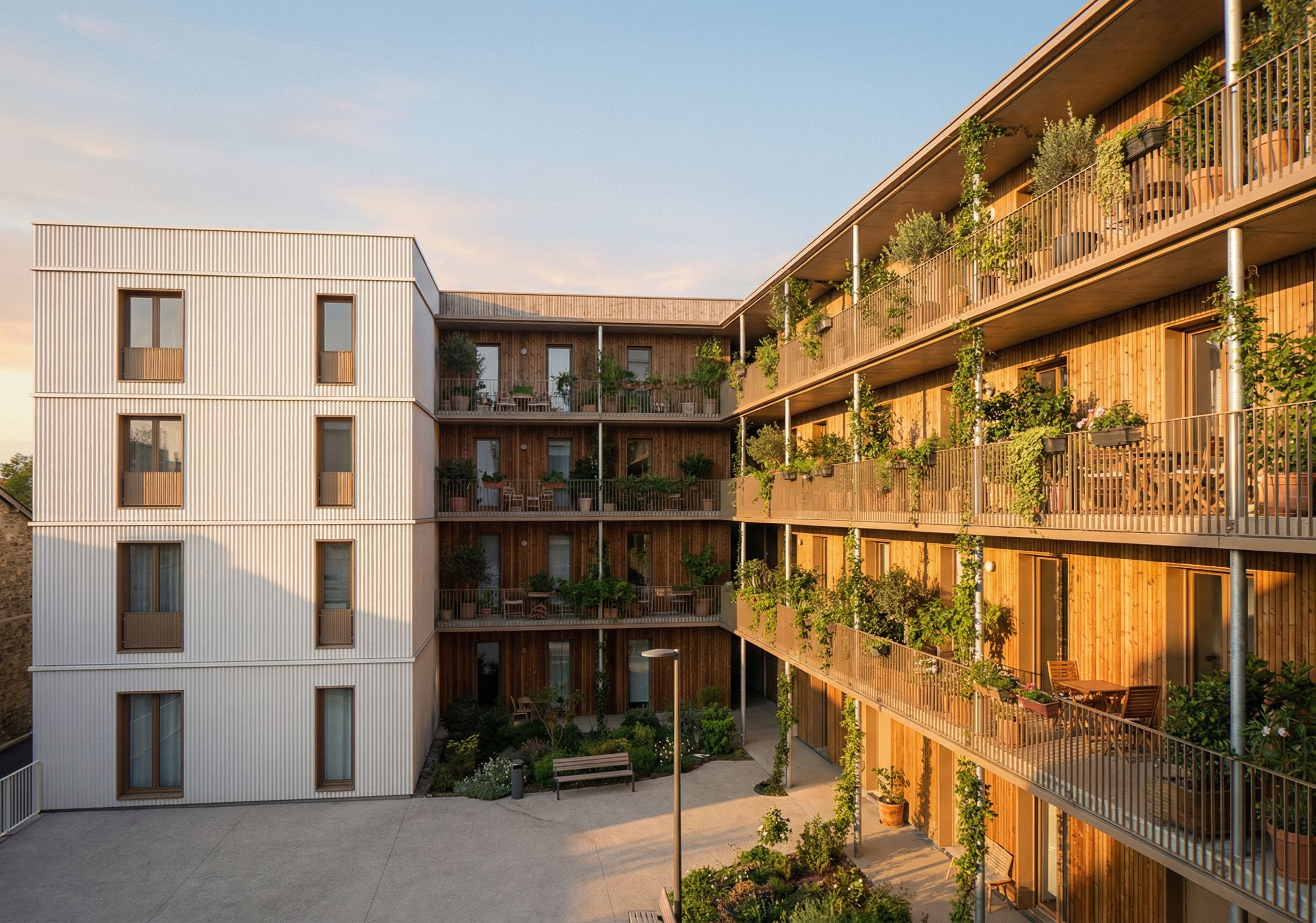 Promptplease, use the new sketched image I uploaded. add there some grenery on the balconies, some furniture. try to keep the same atmosphere like on the referece pictures., keep exact camera angle