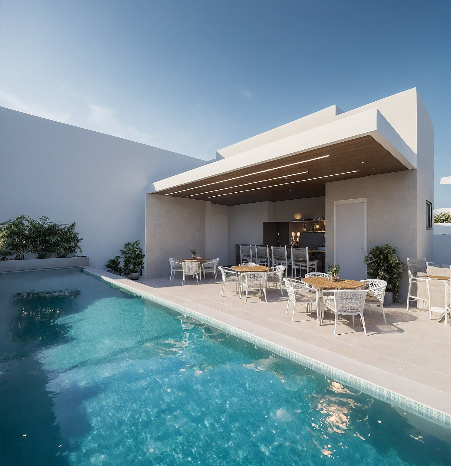 Prompta more realistic space in a sunset, more modern and happy, the pool needs to be very exciting and has to be bright. Need to be the exact same space. The chairs and tables cannot be with wood, needs to be aluminium, and the wall needs to be have a wood frame.