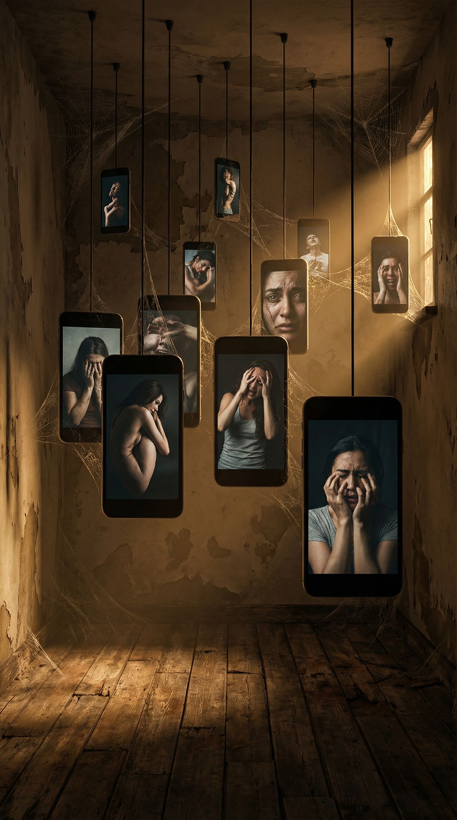 Promptinterior design rendering, render this sketch into photorealistic rendering, Create an image like the sketch. There are cell phones hanging in a room. On the screens of each phone are images of different people suffering. The room is gloomy, the lights are dim, and there are also many cobwebs. There is a very high window through which a ray of moonlight enters from outside. The floor is made of old, damaged wood., keep exact camera angle, golden hour warm lighting, including ambient lighting, high quality, professional, detailed scene