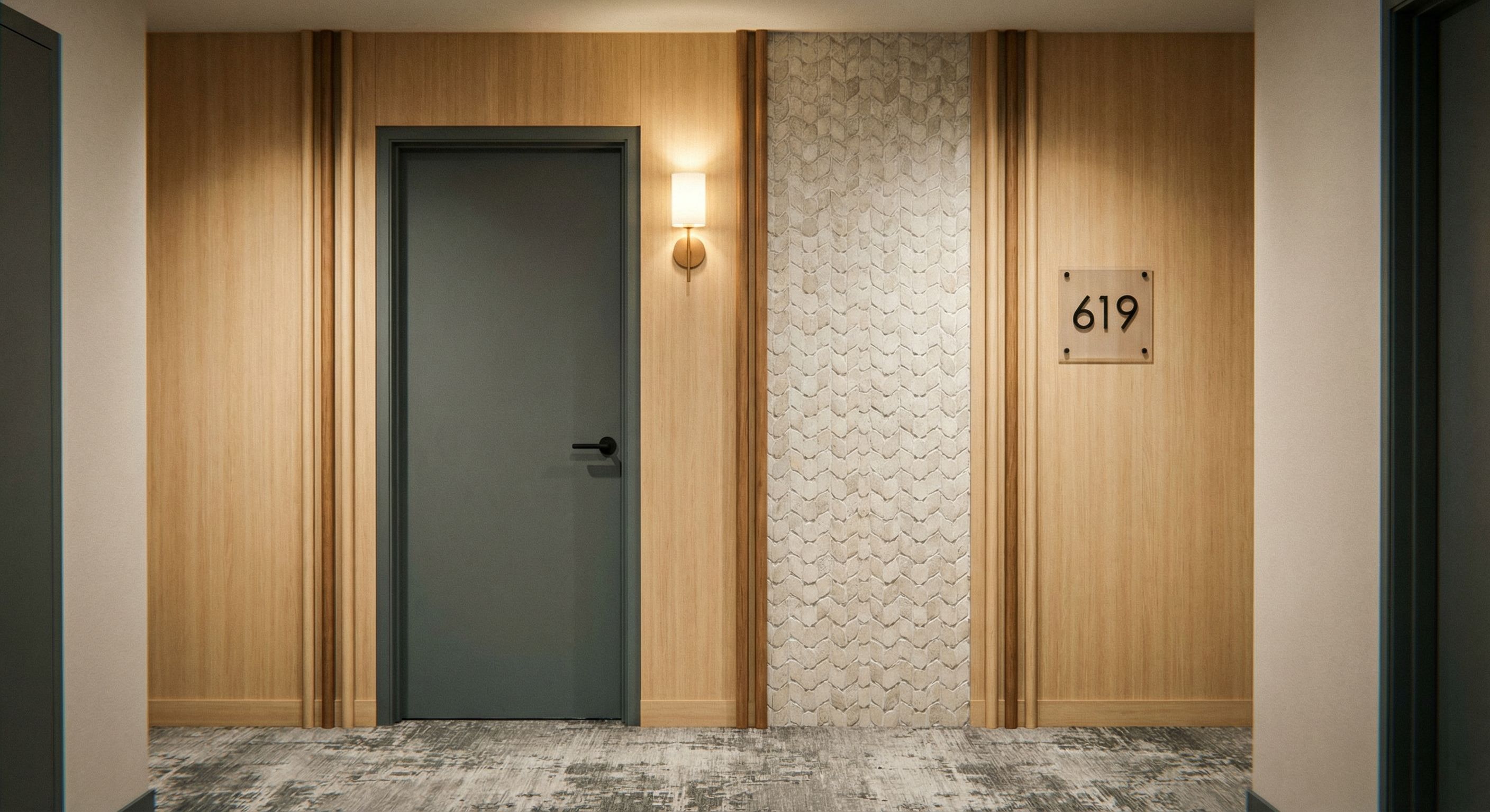 Promptthis is a suite entry in an apartment building corridor. i have included a reference image of the suite number sign, and another image of the materials we need to incorporate into the image. there should be a black door lever, the vertical brown wood strips are half round wood dowels in pairs of 2. , keep exact camera angle