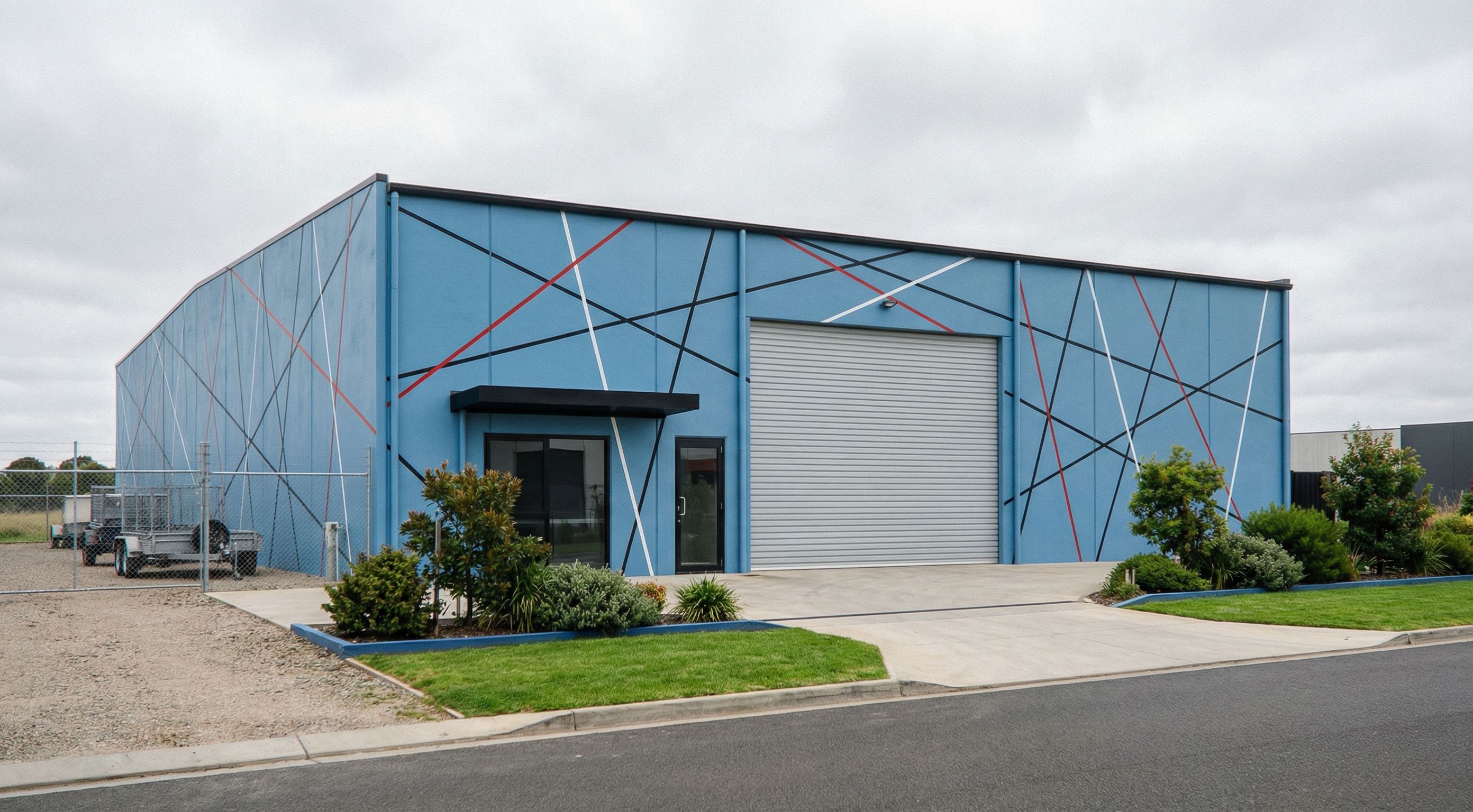 Promptcreate a bitumen road to the site frontage, add grass to the front green areas, add landscaping shrubs to the blue areas either side of the driveway, make the driveway and apron at the front of the building concrete, on the left hand side ground make that gravel and place a chainware fence that is transparent to the left hand shide of the building as shown in the upload image. the building will be a concrete tilt panel building. make the glass door at the front have a colorbond monument frame. suggest the building be a medium sky blue with a random pattern in the front like a couple of thin black, red and white lines that cross and intersect with each other. roller door to be a light colour. the awning colour to be black. follow the same pattern from the front facade and continue this down the left hand side of the building walls. behind the fence add a car trailer., keep exact camera angle, keep exact camera angle