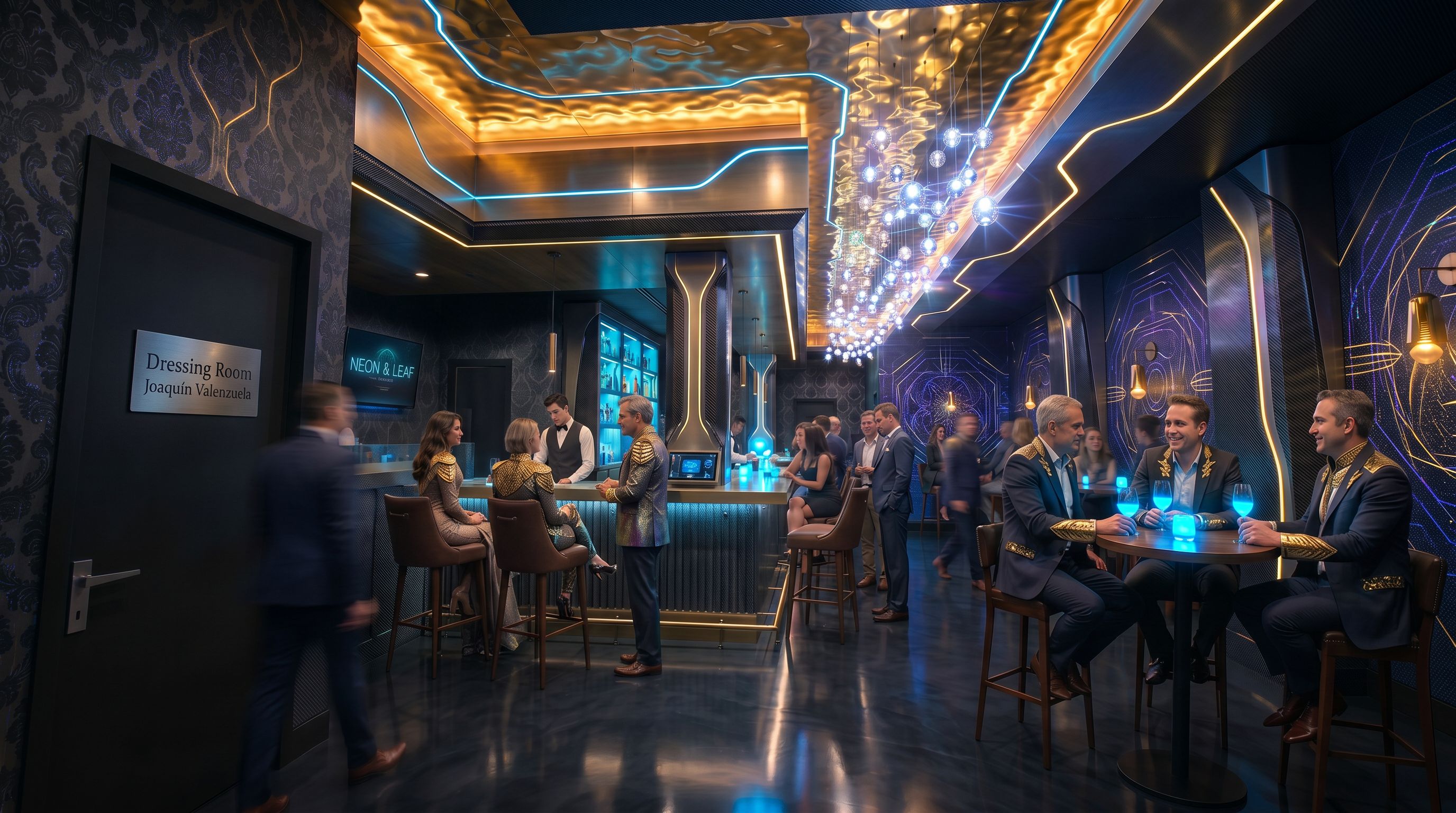 Mantén la arquitectura general de la imagen, el mismo tipo de taburetes, las mismas personas y mantén el formato apaisado de imagen, en horizontal de ancho por alto y haz los siguientes cambios: Crea un estilo ultra futurista, con un decorado totalmente rompedor, como de películas de naves espaciales, con bebidas azul eléctrico y fluorescentes, con personas vestidas con ropas muy elegantes con detalles metálicos dorados como en la película Acquaman., keep exact camera angle