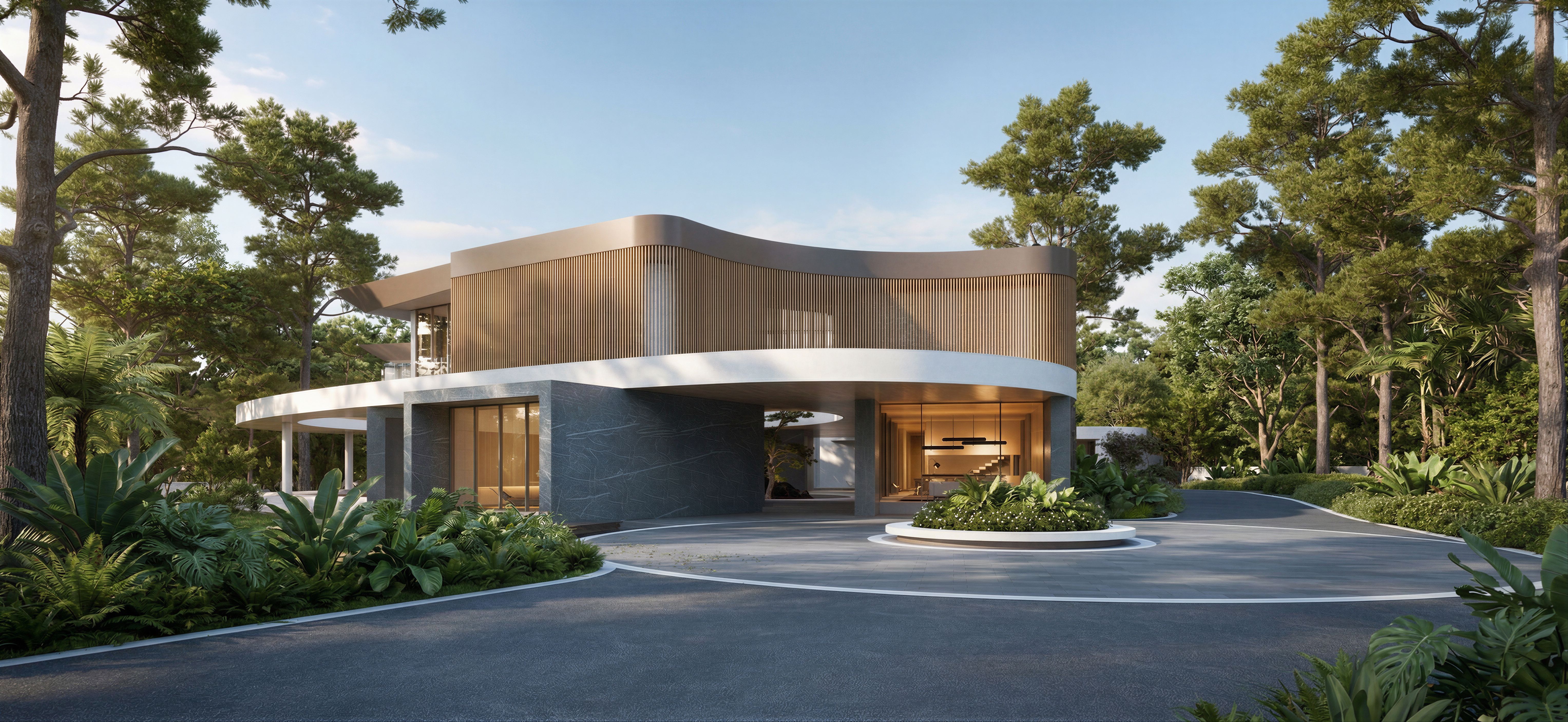 EnhancedPromptPhoto of an ultra minimal luxury villa , emphasizing sleek lines and a combination of wood and stone materials. The structure features large glass windows, vertical wooden slats, and a distinctive curved brownish gray metallic roof edge. Surrounded by tropical lush greenery, tall trees, dark grey ansphalt road leads to circular drop off area with dark grey granite paving, with no cars in the image. Afternoon sunlight casts soft shadows, highlighting the architectural details. Wide-angle perspective captures both the building and its inviting entryway, enhancing its elegance and integration with the natural environment., keep exact camera angle