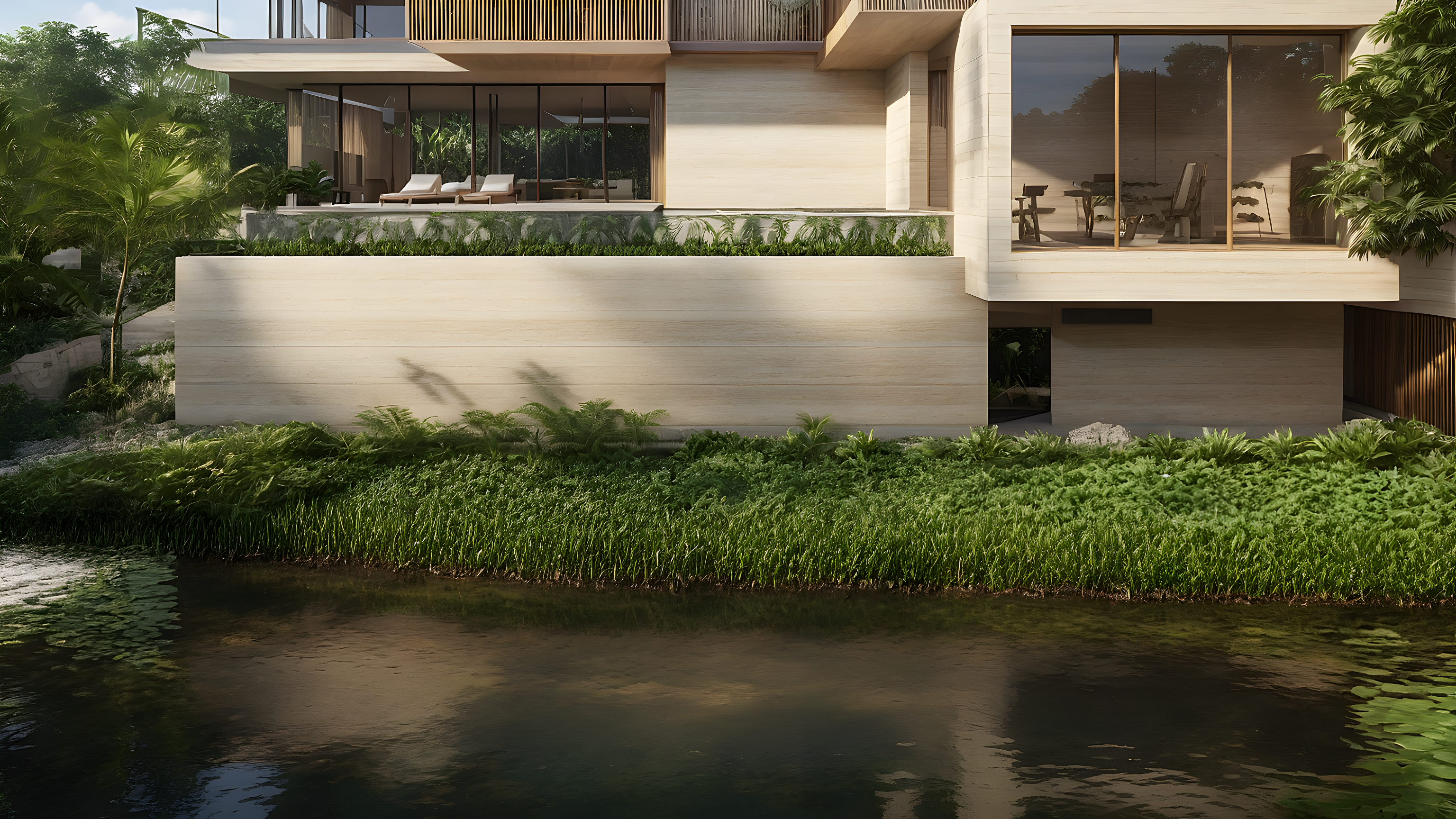 Promptnatural light mood beige smooth travertine vibrant tropical forest landscape with dense groundcovered plants keep building line keep smooth teak wooden wall with fine grooved line natural pond with water plants at front