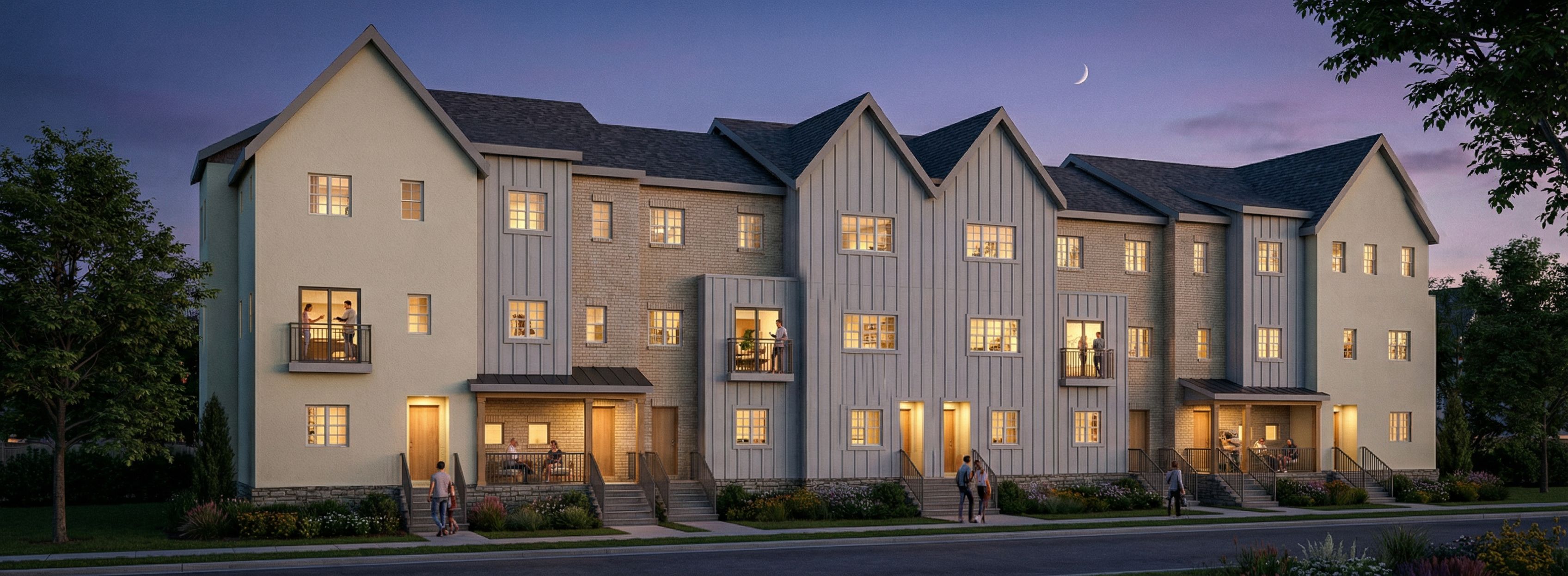 FARMHOUSE STYLE TOWNHOUSE IN DEEP SOUTH WEST OF CALGAR ALBERTA WITH PEOPLE VISIBLE LIVING IN THE WINDOWS AND OUTSIDE. LIGHTS ARE ON AND ITS DUSK, SLIVER OF CRESCENT MOON IN THE SKY.THE CLADDING VARIED SLIGHTLY UNIT TO UNIT FROM DIFFERENT PALE SHADES OF STUCCO TO BOARD ND BATTEN AND PALE BRICK, keep exact camera angle