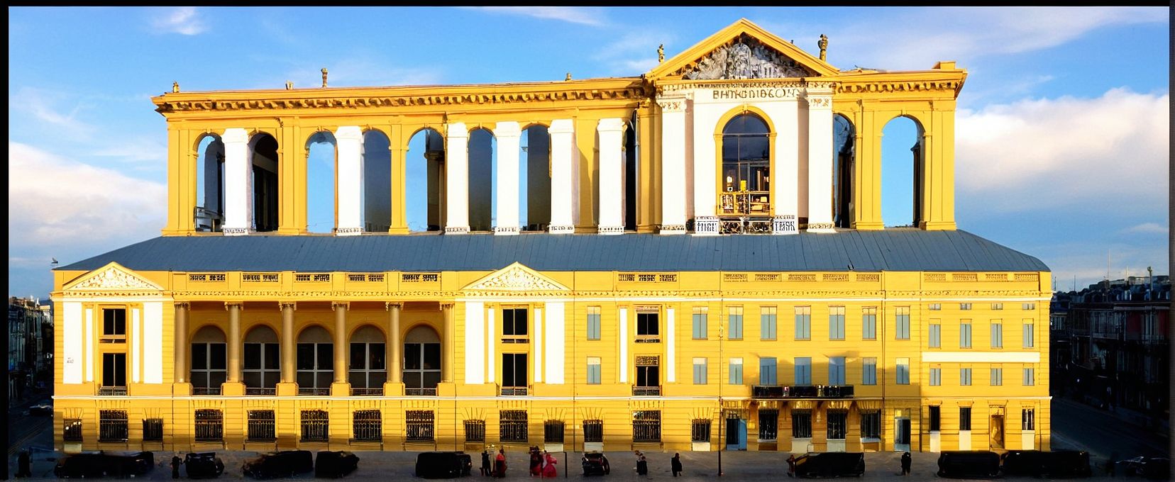 Historic building of neoclassic style. A setbacked balcony behind the columns. Fullheight cristal windows with half-point archs on top at the back of the balcony. Pale yellow color in the entire building except for the columns that are white. Entrances in the groundfloor with two steps above the ground level. Blue skies without clouds. Shadow at 45 degree angle