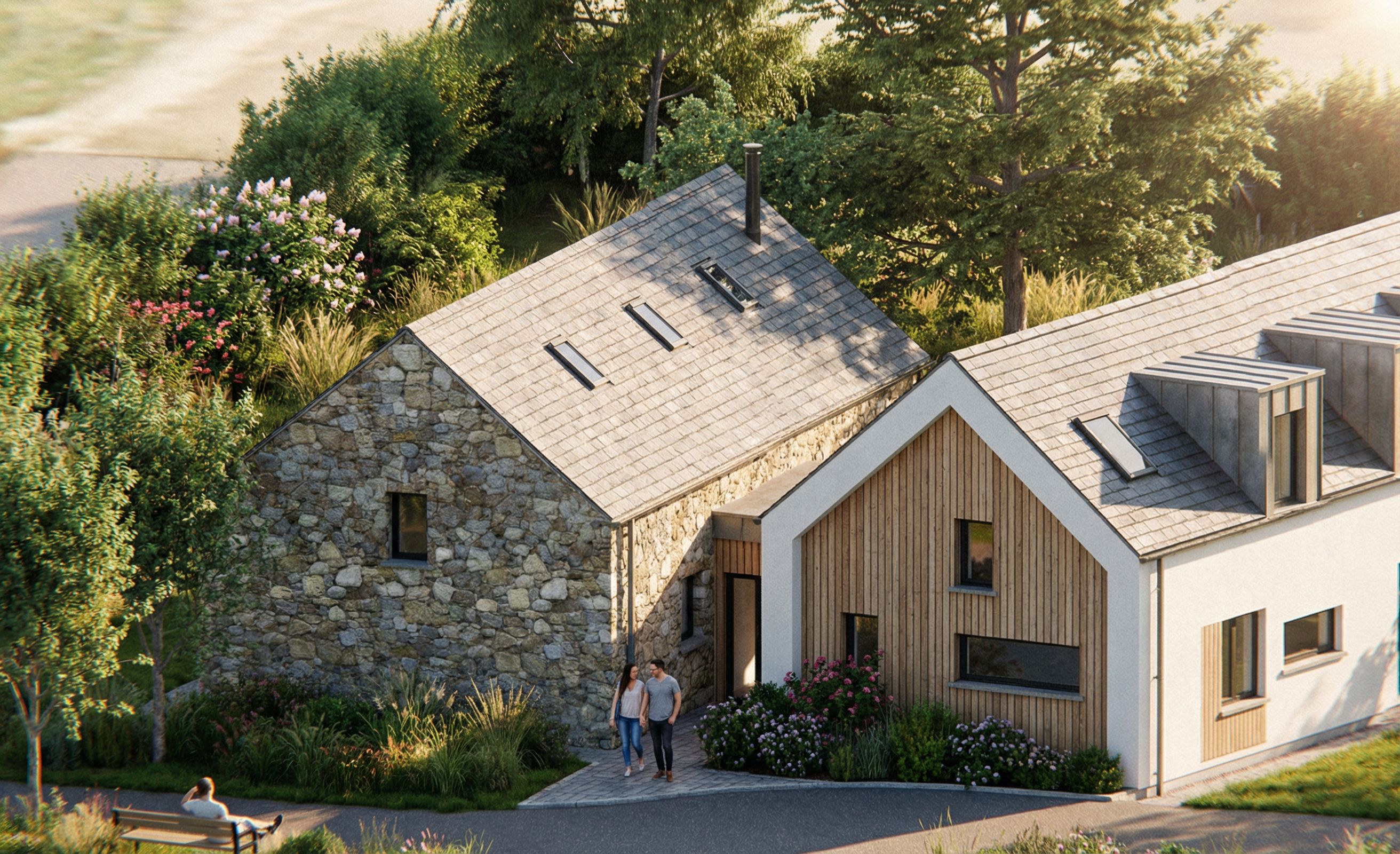 Stone building to the left with a contemporary white rendered building with vertically timber detailing on gable building to the right, with zinc dormers., keep exact camera angle