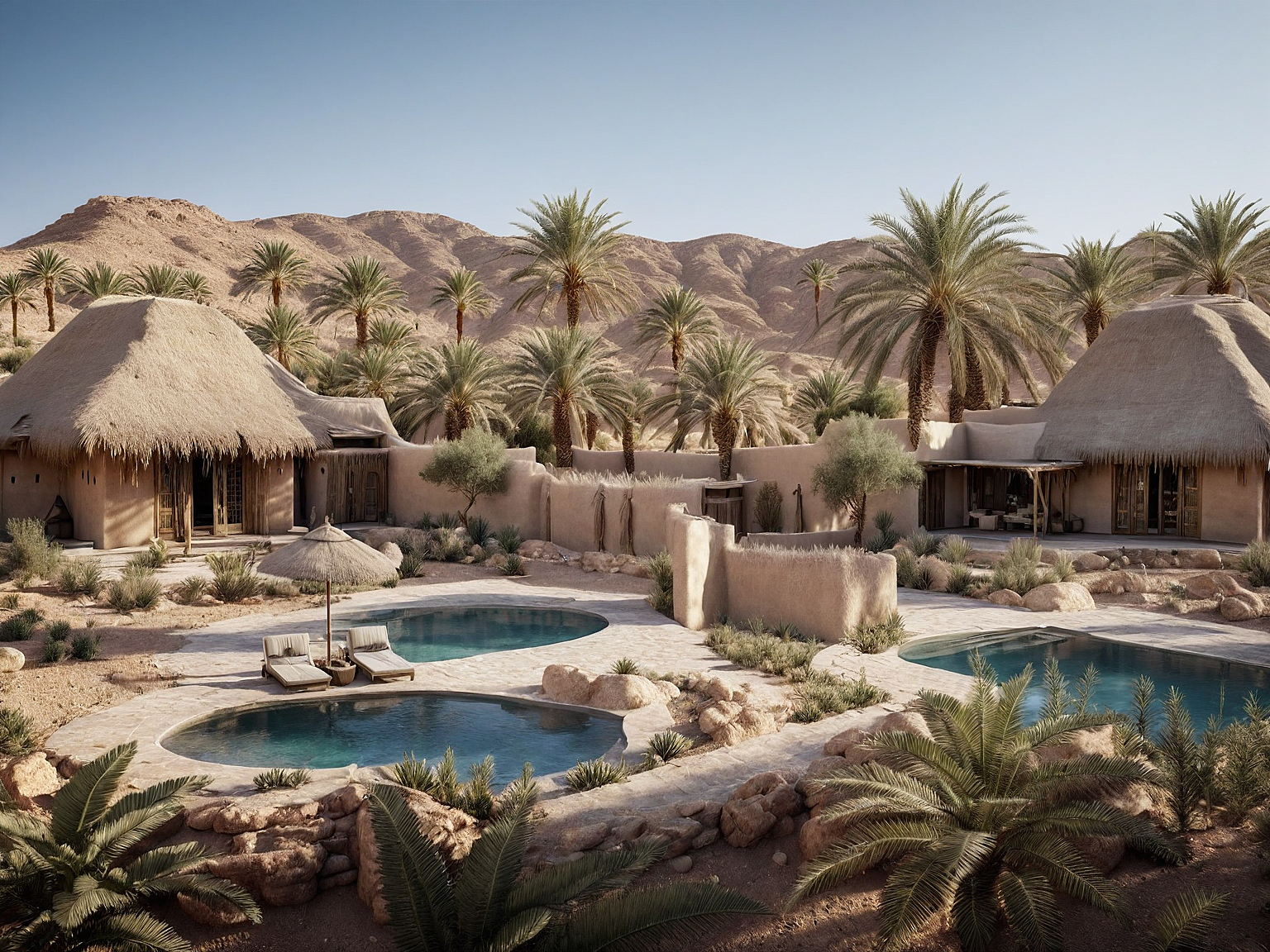 two mud houses arabian houses with thatched roof one has a pool and one doesnt aerial view in a desert resort. create a realistic looking rendering enhance the lighting in the daytime. the mountain in the backdrop is very short use the same one as the picture.