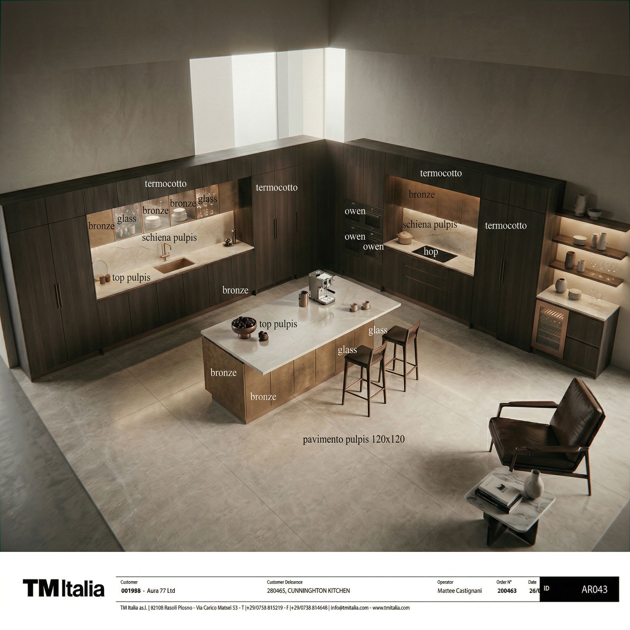 the island cabinet needs to be in bronze, the two cabinets where it says glass make it glass and loer cabinets only those two cabinets in glass,the two wall units over the sinks needs to be in bronze where it says bronze, the worktop in the island needs to be 2cm thiknness, keep exact camera angle