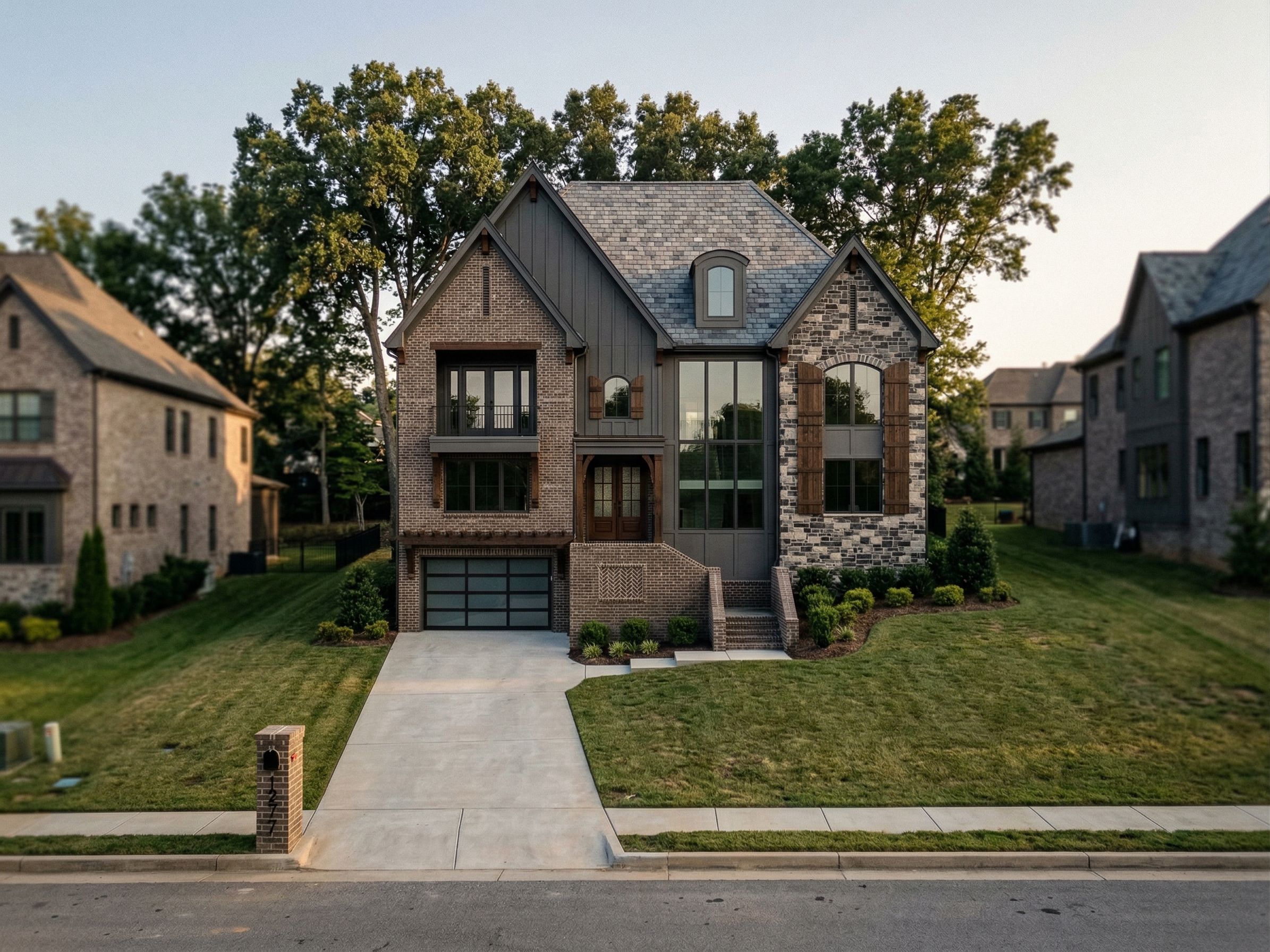 Render this contemporary house on main street. With close adjacent similar properties. Dark brick veneer. Mixed dark and light bed stone. Dark vertical siding from upper wall and wall directly below. Smooth paneling wall with large windows. Smooth paneling wall with arched dormer. Carriage style shutters. Rectangular glass panel garage door. No window grids. Dark stained open trellis over garage door. Dark stained wood accents and brackets. Double entry door. Decorative masonry insets in masonry walls. Captured with a slight low angle camera lens. Sided enclosed mailbox. Slate shingle roof., keep exact camera angle