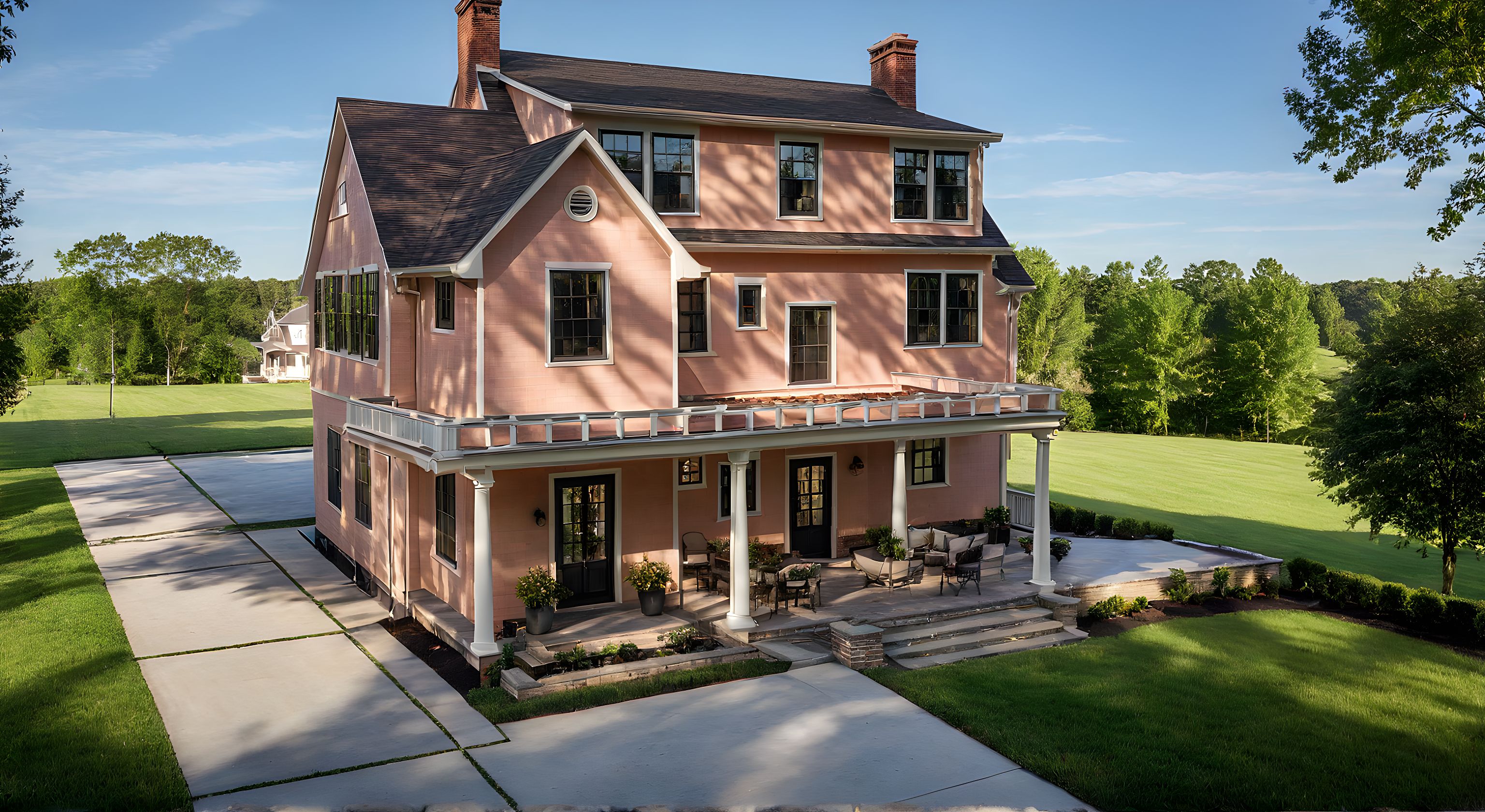 PromptPhoto of a classic two-story peach colored residential house featuring a welcoming porch and manicured landscaping. Architectural details include elegant window designs, a gabled roof with shingles, and decorative moldings. The house is surrounded by a lush green lawn, with outdoor furniture set up on the patio. Soft afternoon sunlight casts gentle shadows, highlighting the textures of the brick and siding materials. Captured from a slightly elevated angle using a wide-angle lens to emphasize the structure's charm and the surrounding space, inviting a sense of warmth and comfort in the scene.