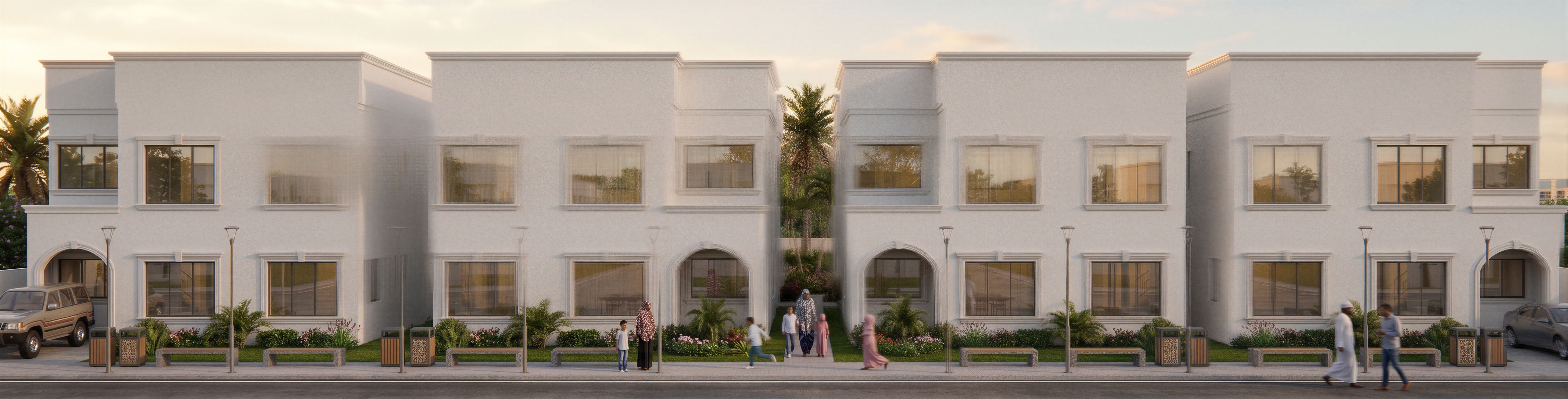 IMAGE OF UNITS WITH A MIDDLE GREEN COURT WITH LANDSCAPING. USE MOULDINGS AROUND OPENINGS AND WINDOWS. MAKE GLASS REFLECTIVE AND REALISTIC. INCLUDE PEOPLE AND CHILDREN OF SOMALI ORIGIN IN THE IMAGE. USE WHITE WALL MASTER ON THE BUILDING. INCLUDE SOME STREET LIGHTS. USE PALM TREES IN THE DESIGN. MAKE IMAGE HIGH RESOLUTION 8K. MAKE IMAGE REALISTIC AND 8K. REMOVE THE CROSS ON THE BUILDING. MAINATIN ORIGINAL UPLOADED DESIGN AND USE REFERENCE FILE FOR MATERIALS ONLY., keep exact camera angle