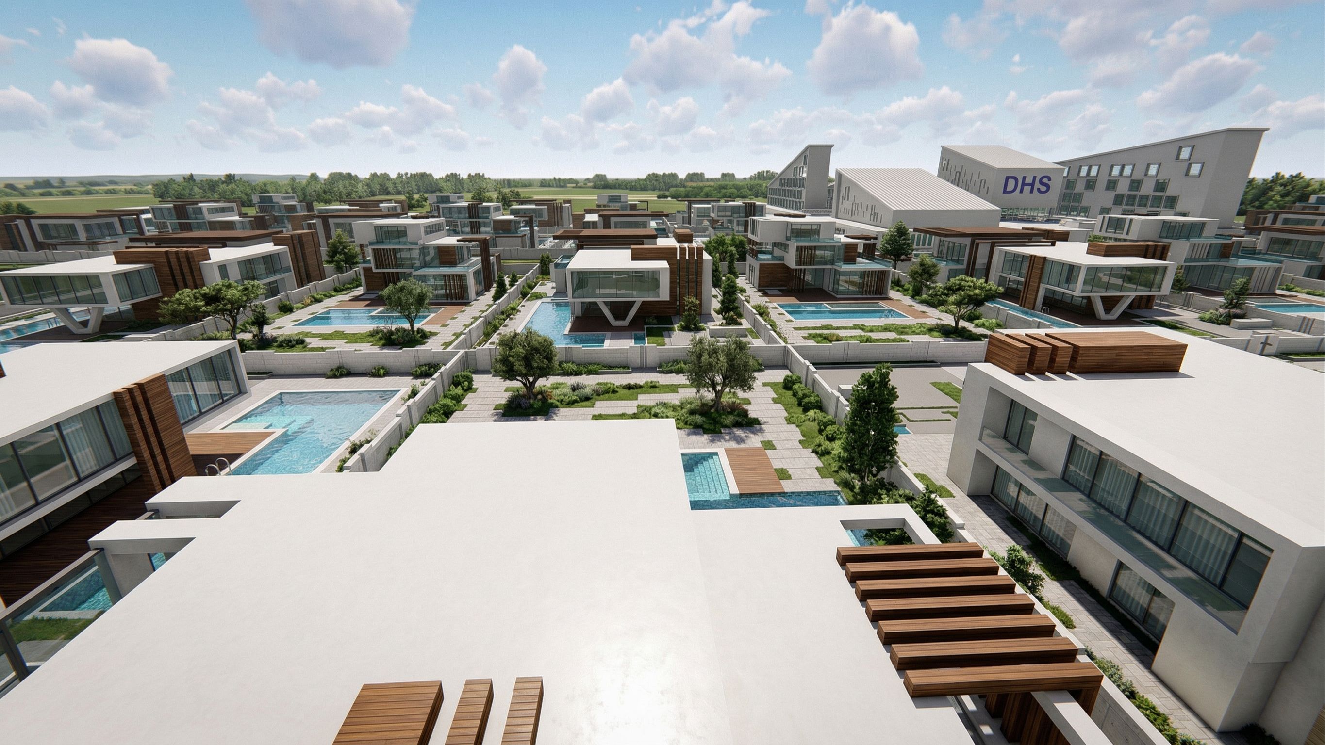 Photo of a modern residential complex featuring sleek, minimalist structures with large glass facades and wooden accents. Emphasize the landscaped surroundings, including multiple swimming pools and some trees. The scene is set under bright daylight, with soft shadows cast by the clouds, enhancing depth. Capture a bird’s-eye view angle, showcasing the interconnectivity of the buildings and outdoor spaces, using a wide-angle lens to convey a sense of spaciousness and harmony within the urban environment., keep exact camera angle