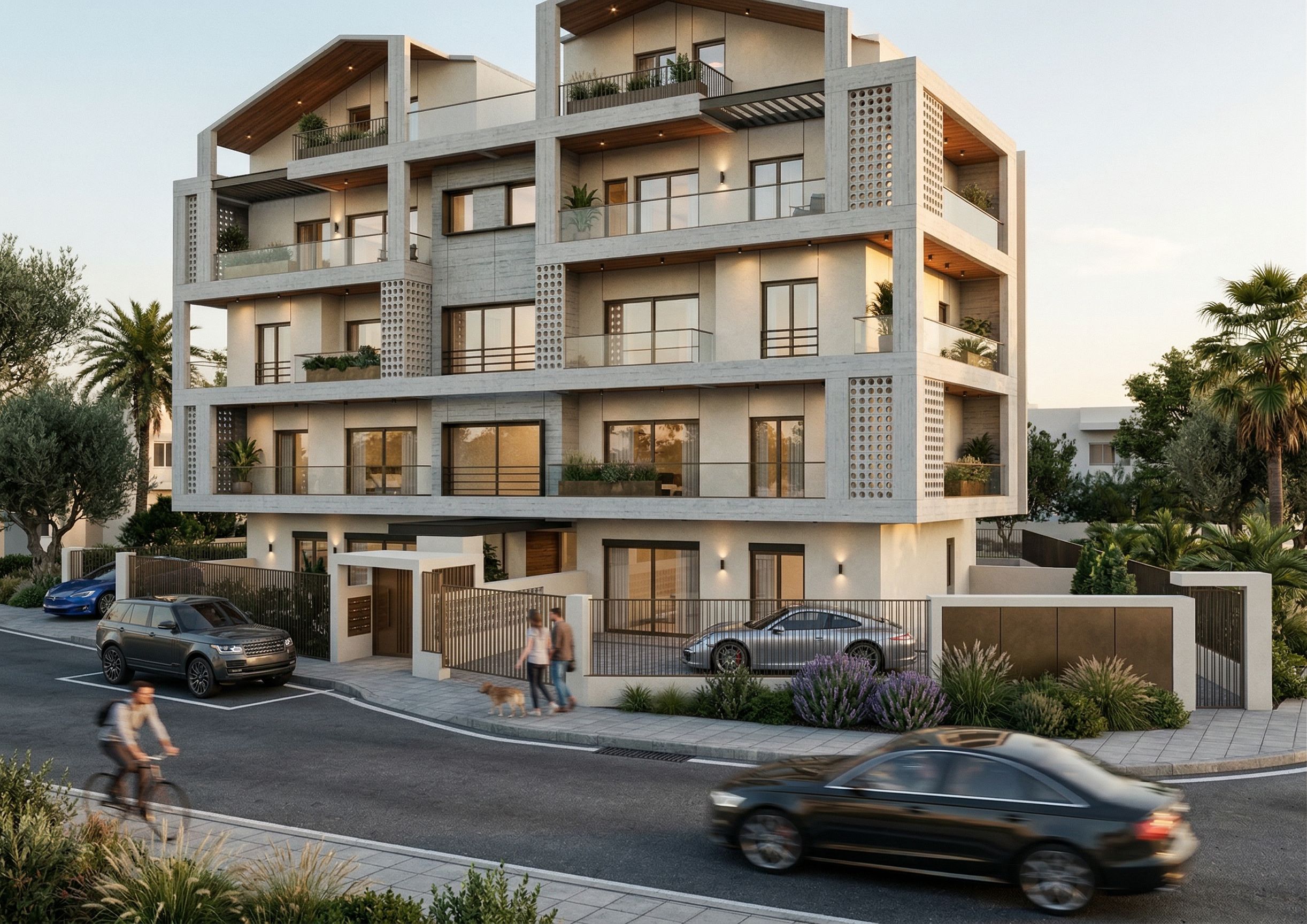 PromptModern block with large bronze windows, materials such as concrete,vanilla plaster,metal, Cement Breeze Blocks surrounded with greenery. Put at the left side in front of the left window a car . Also put at the left side of the building a car. Put at the right side in front of the big window a car and add besides this car a few bushes. Put in front of our building a road with a car. , keep exact camera angle