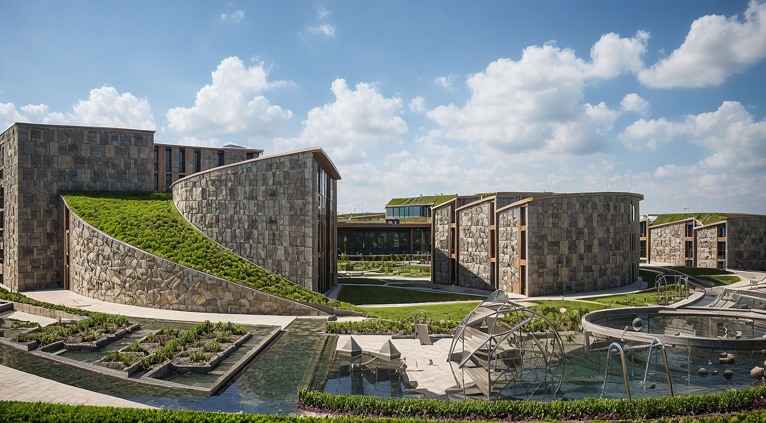 PromptPhoto of a contemporary residential complex featuring elegantly curved buildings with green roofs and textured stone facades. Surrounded by manicured gardens, playful installations, and a tranquil water feature. Natural sunlight bathes the scene, enhancing shadows and reflections on the water's surface. Captured from a low-angle perspective to emphasize the organic shapes of the architecture, using a wide-angle lens to encompass the vibrant surroundings and create depth in the composition.