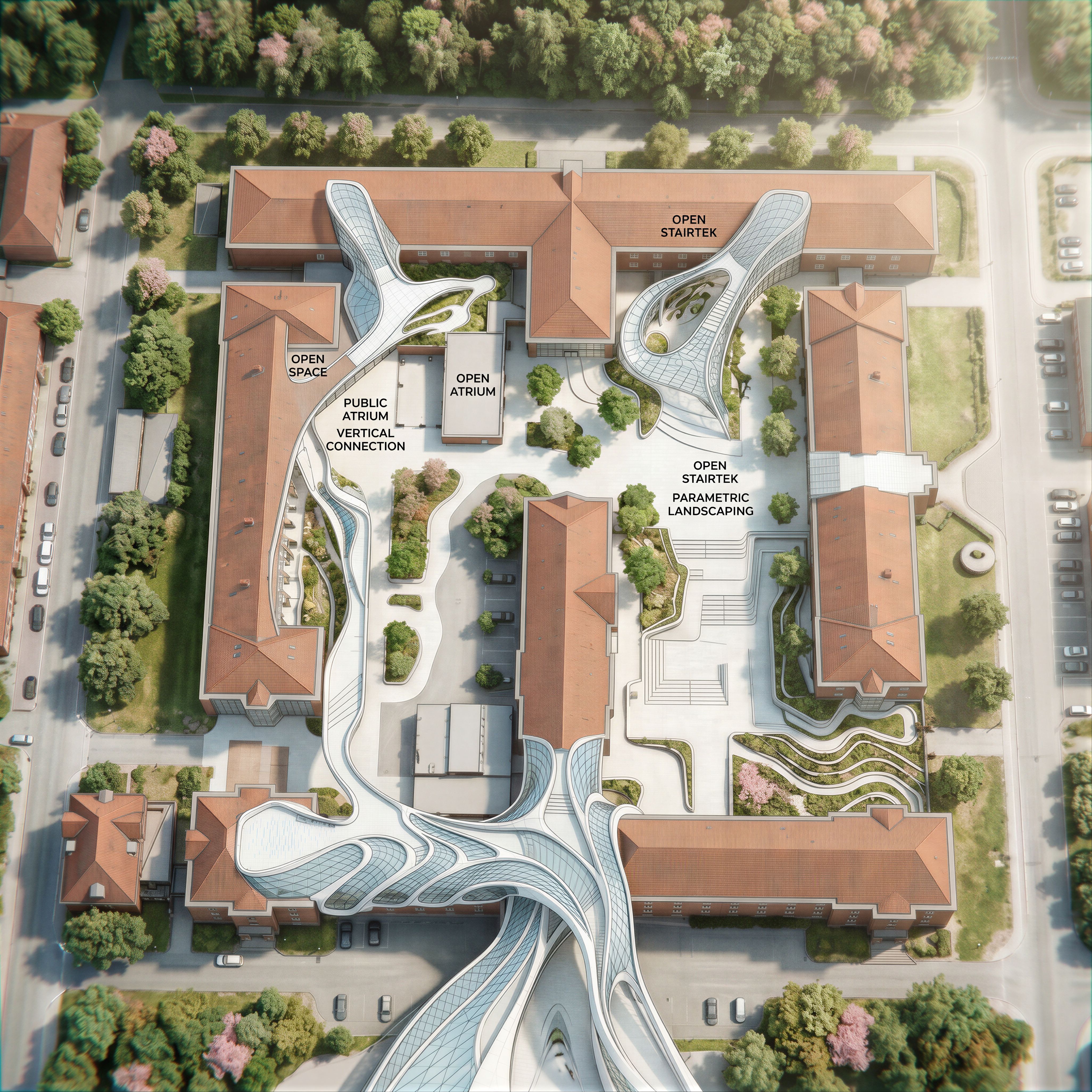 PromptCreate a top view floor plan for an architectural competition table of the area shown in the main image. Use the same graphics and style as the reference image1. , keep exact camera angle