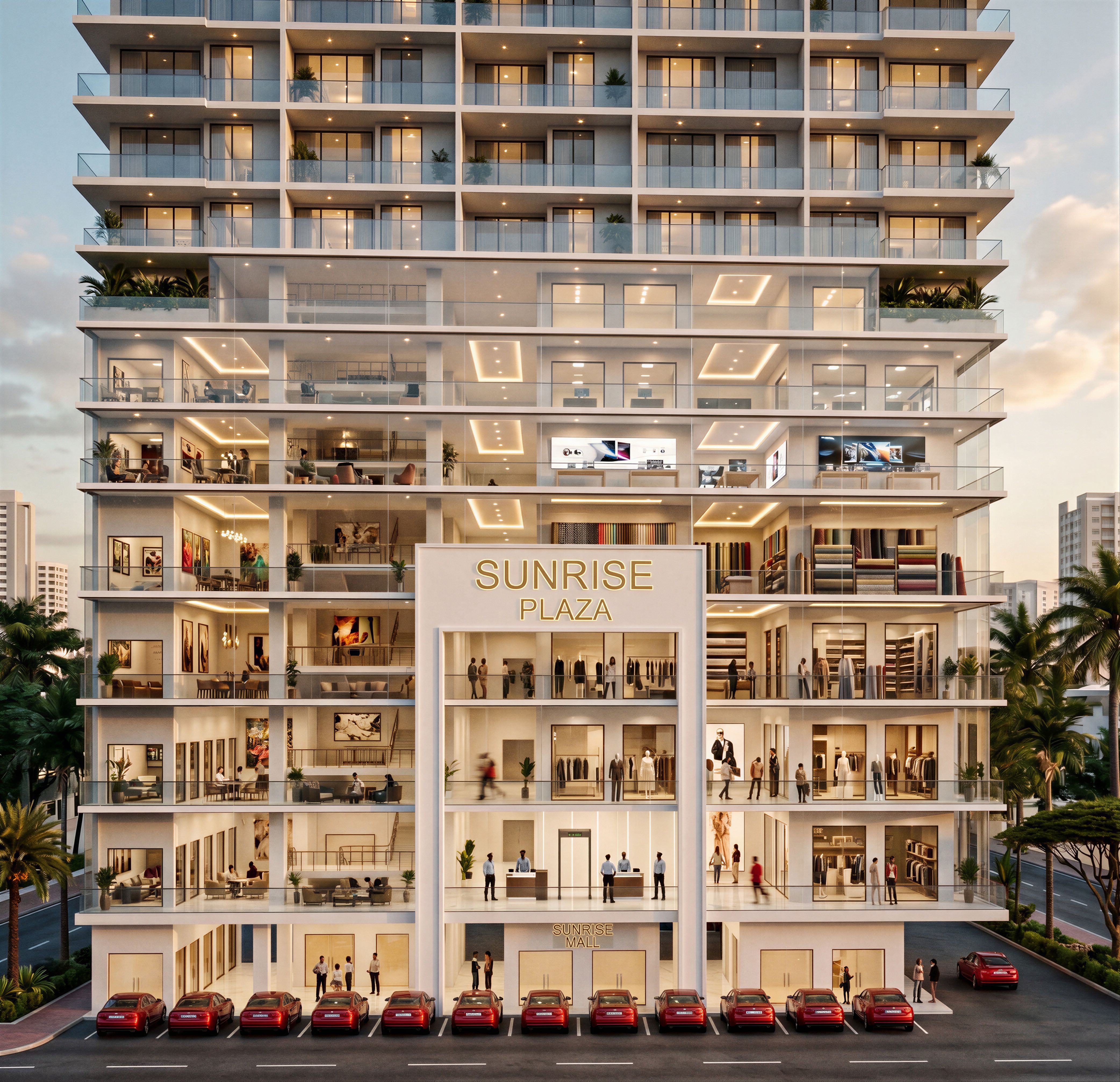 EnhancedPromptMAIN ENTRANCE OF A HIGH END SHOPPING VIEWED FROM THE ROAD. MAKE EXTERIOR HIGH END WITH DIFFERENT SHOPS FOR CLOTHGES, MATERIALS AND ELECTRONIC ON RIGHT SIDE SHOWING . SECURITY CHECK AT THE ENTRANCE.. TURN ON THE LIGHTS IN THE SHOPS . HAVE THE NAME "SUNRISE MALL" ON ONE OF THE WALLS AT THE ENTRANCE. MAKE RESOLUTION HIGH AND PHOTOREALISTIC 8K. MAKE BALUSTRADES BE OF CLEAR GLASS. MAKE WALLS, COLUMNS AND CEILINGS BRILLIANT WHITE AND ELEGANT. USE PORCELAIN TILES ON FLOOR. PUT PEOPLE OF SOMALI AND AFRICAN ORIGIN IN THE IMAGE., keep exact camera angle