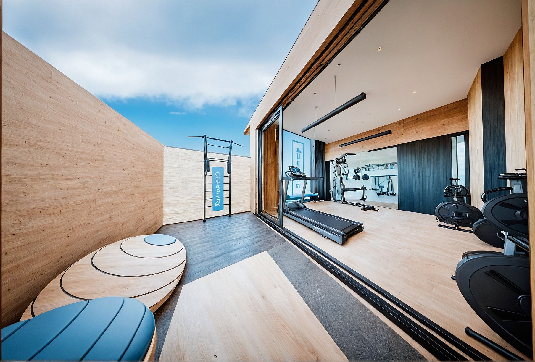 OUTDOOR AREA OF A MODERN GYM, LOOKING TO THE SCENE