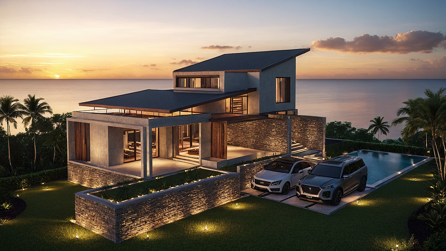 Prompttropical contemporary villa concrete stonework metal wood tropical landscape sunset mood