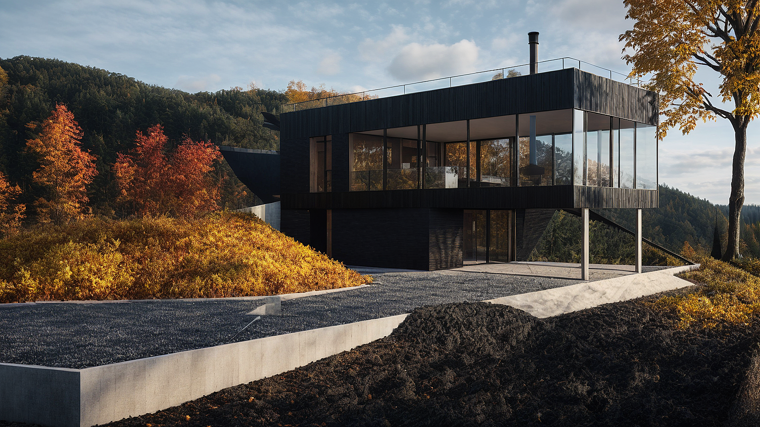 Promptautumn day, background forest with high trees on the left, background forest with high trees on the right, reflective glasses, black charred wood cladding, non reflective ground