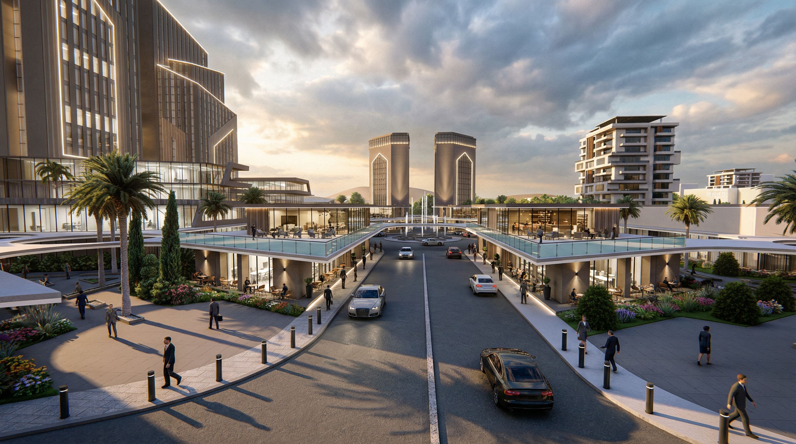 Promptthis is a scene in a buisness center ...the main axe to a twin towers is for cars.. and there is offices and cafeterias along the axe ... enhance the materials .. make everything super realistic and addd people.. and add handrails for the white slab above in the second floor.. add lights ,, make the scene alive ADD LUXURY CAFETRIAS ON THE SECOND FLOOR AROUND THE MAIN AXES ONLY ADD WALKING PEOPLE ON THE PAVEMENTS THE LIGHTS IN THE OFFICES SHOUD BE MORE TO WHITE NOT YELLOW ADD LIGHTS TO THE TWIN TOWERS, keep exact camera angle