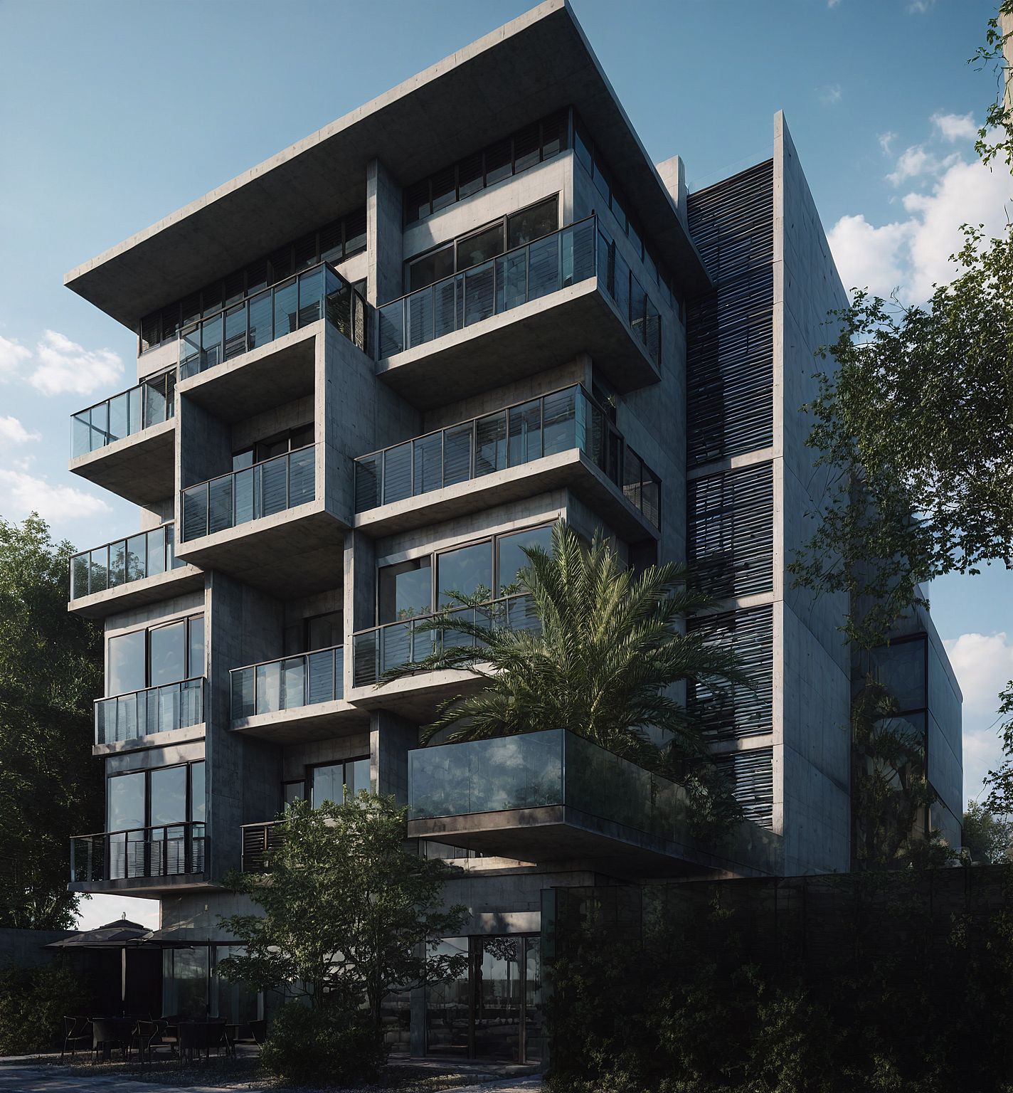 PromptMODERN BUIDING ,CONCRET WALLS. GLASS. LOUVRES. COLOR FACADE. BLACK WINDOWS FRAMES