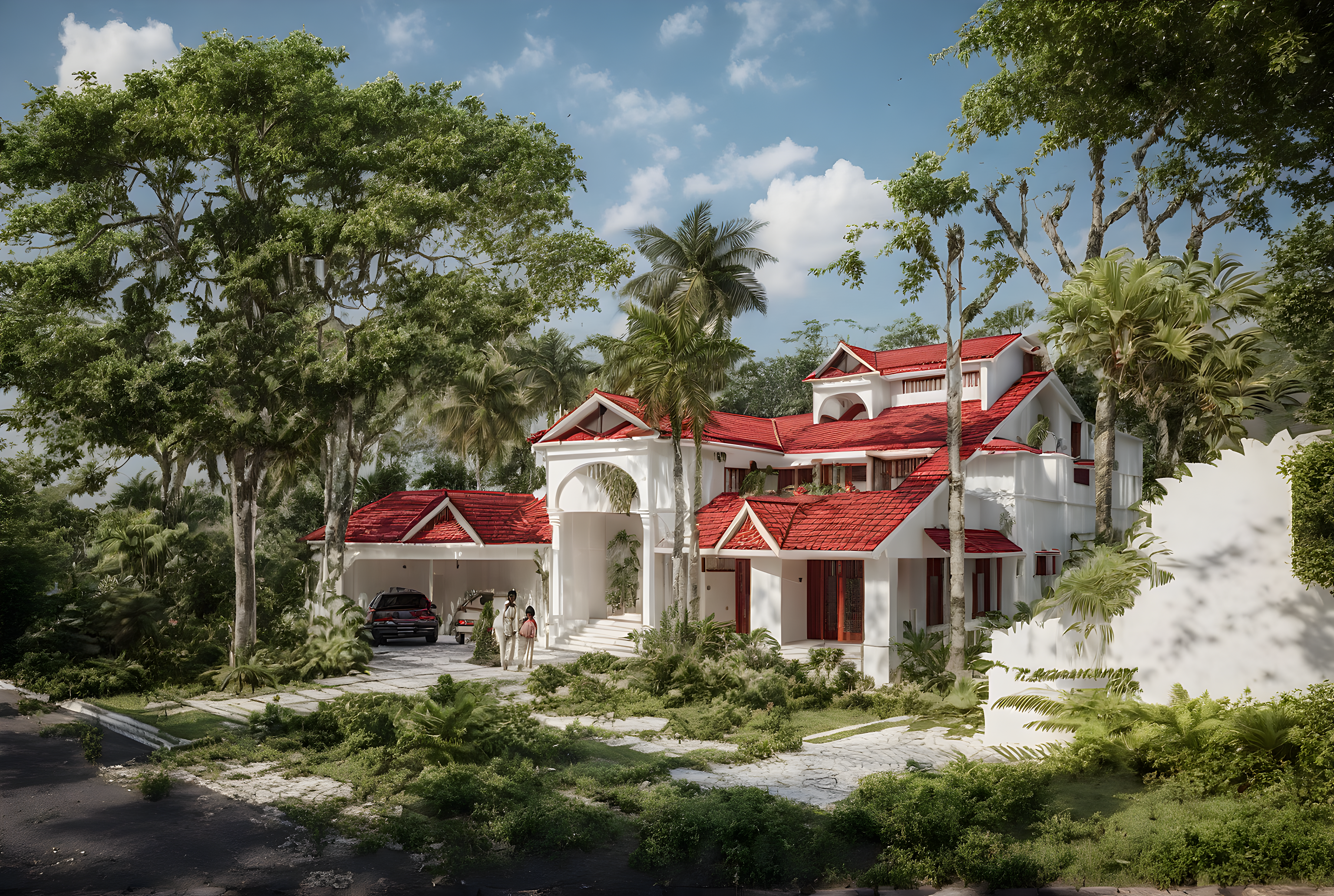 PromptDetailed photo image like a attached tropical South Indian Villa with white painted All walls with red color sloped roofing tiled roofs with a car in portico as per attached sketch also with human beings and surrounded with trees and coconut trees and lawn and plants.