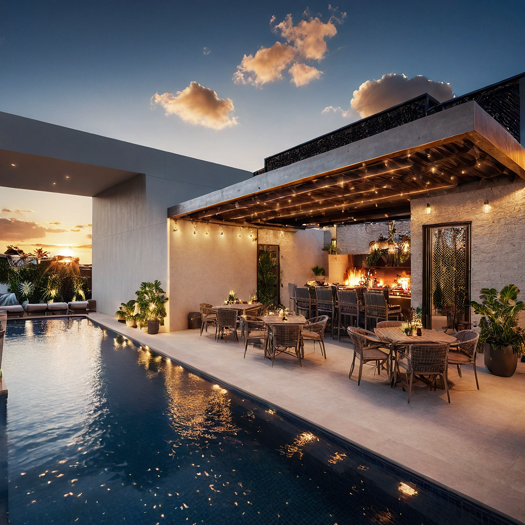 make this rooftop image with barbecue more realistc, with a beautiful sunrise light. The pool needs to be very realistic and exciting.