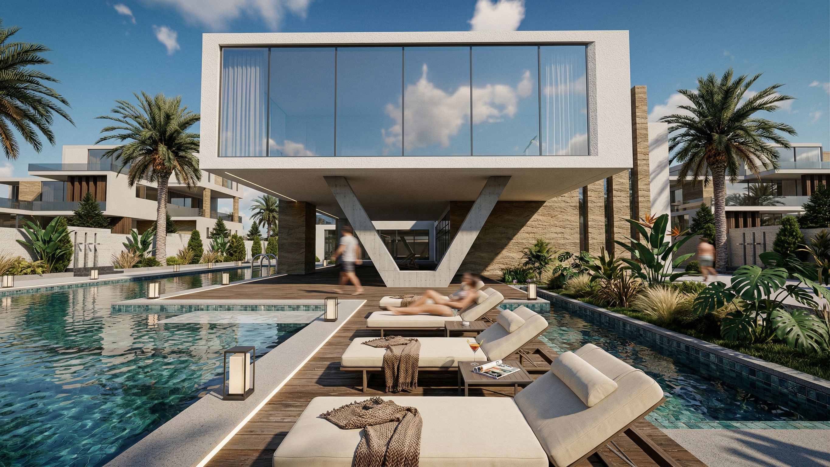 PromptUltra-realistic rendering of a modern villa with large, elegant swimming pools, featuring luxurious chaise lounge chairs and stylish poolside furniture. Add floating pool lanterns or soft, ambient lighting around the pool area for a serene evening effect. The pool area should have high-end materials like natural stone and ceramic tiles with rich textures. The lounge chairs should have plush cushions, sleek modern design, and some scattered beach towels for a relaxing atmosphere. Include a variety of plants, such as palm trees or decorative greenery, along the poolside for added natural beauty. Focus on natural lighting with soft shadows and realistic reflections on the water's surface. The villa’s outdoor space should feel upscale, relaxing, and inviting., keep exact camera angle