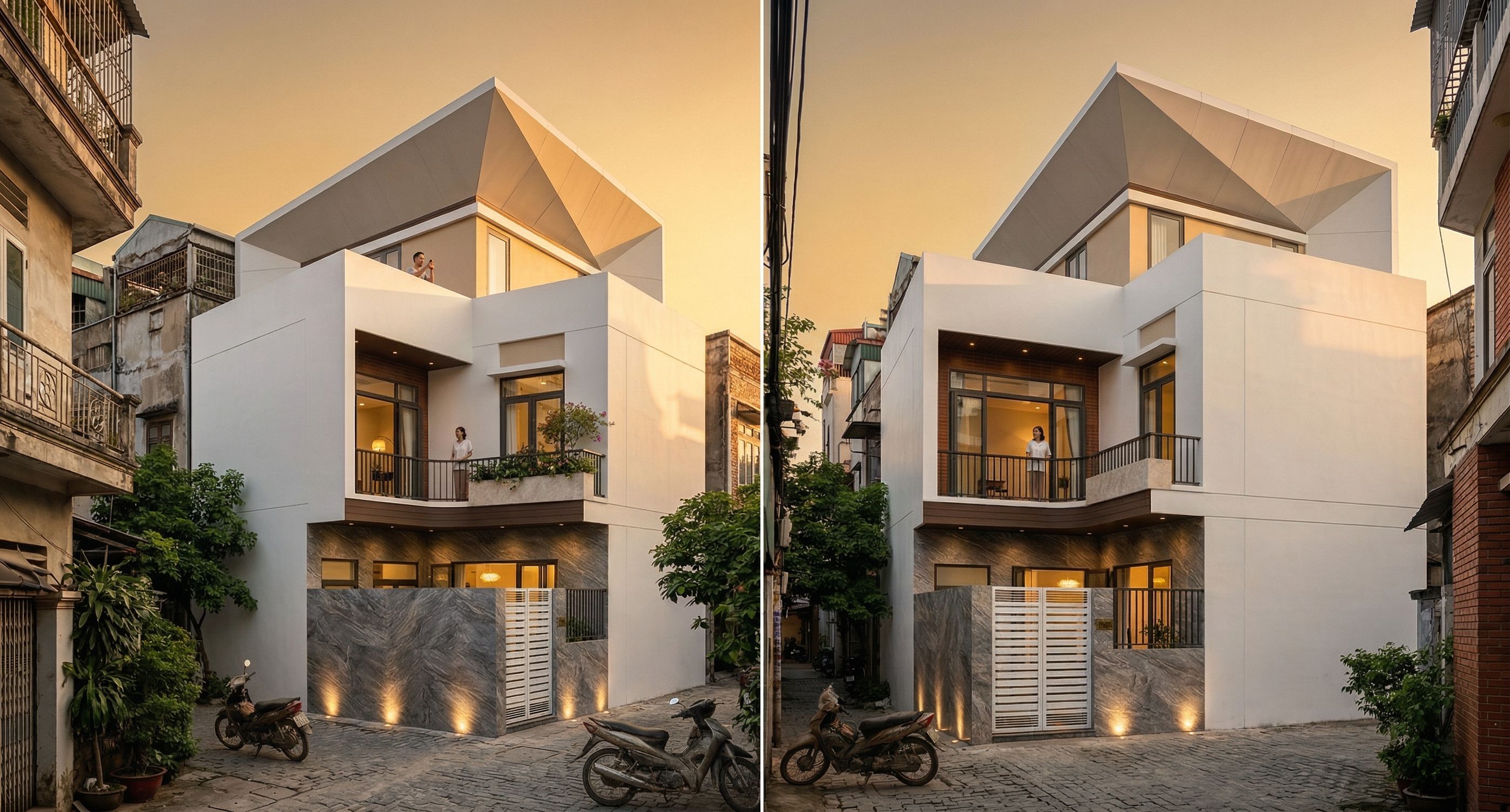 PromptThis photograph captures a modern, two-story apartment building with sharp, angular design, eliminating the flat roof and rooftop garden. Architectural details include smooth white walls, natural stone cladding, and large glass windows that allow natural light to flood in. Situated in a narrow alley in the heart of the city, surrounded by traditional buildings and greenery, the scene creates a striking contrast between old and new. The setting sun creates warm tones, highlighting the texture of the materials. The photograph is taken from a slightly elevated angle with a wide-angle lens to encompass the surroundings and emphasize the building's presence within the landscape., keep exact camera angle
