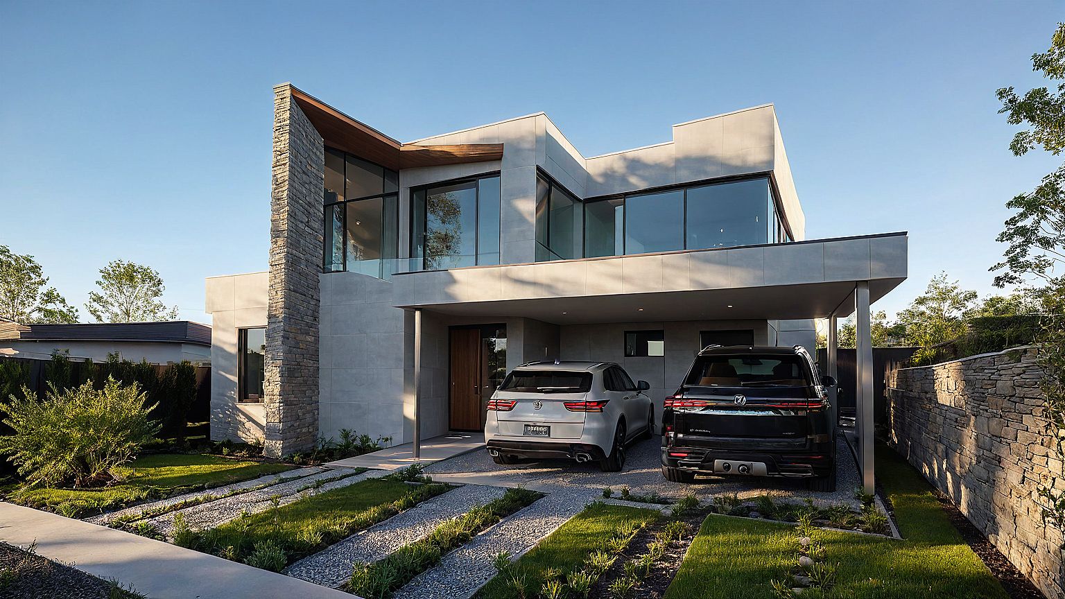 PromptPhoto of a contemporary two-story residential house featuring unique stone cladding and a sleek carport. Emphasize the interplay of light and shadow during the golden hour, creating warmth across the facade. The setting includes manicured lawns and carefully arranged pathways leading to the entrance. Capture the scene from a slightly elevated angle, showcasing both the structure and the surrounding greenery, using a wide-angle lens to enhance depth and perspective. Highlight textures of materials like stone, glass, and metal for a lifelike quality.