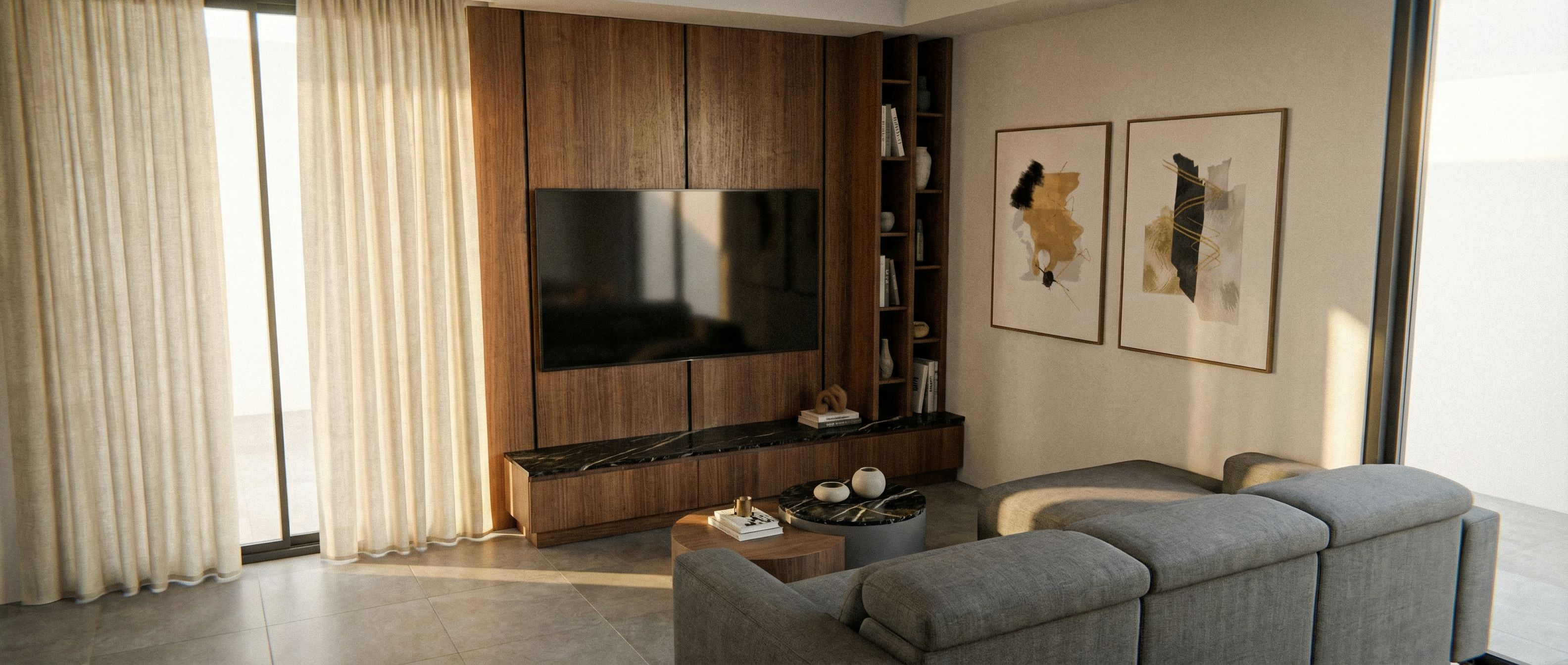 PromptMake a realistic render, highlighting the texture of the walnut-colored wood and the Vialactea granite, generating a warm and welcoming environment, add a curtain over the window in cream color, make it look naturally illuminated., keep exact camera angle