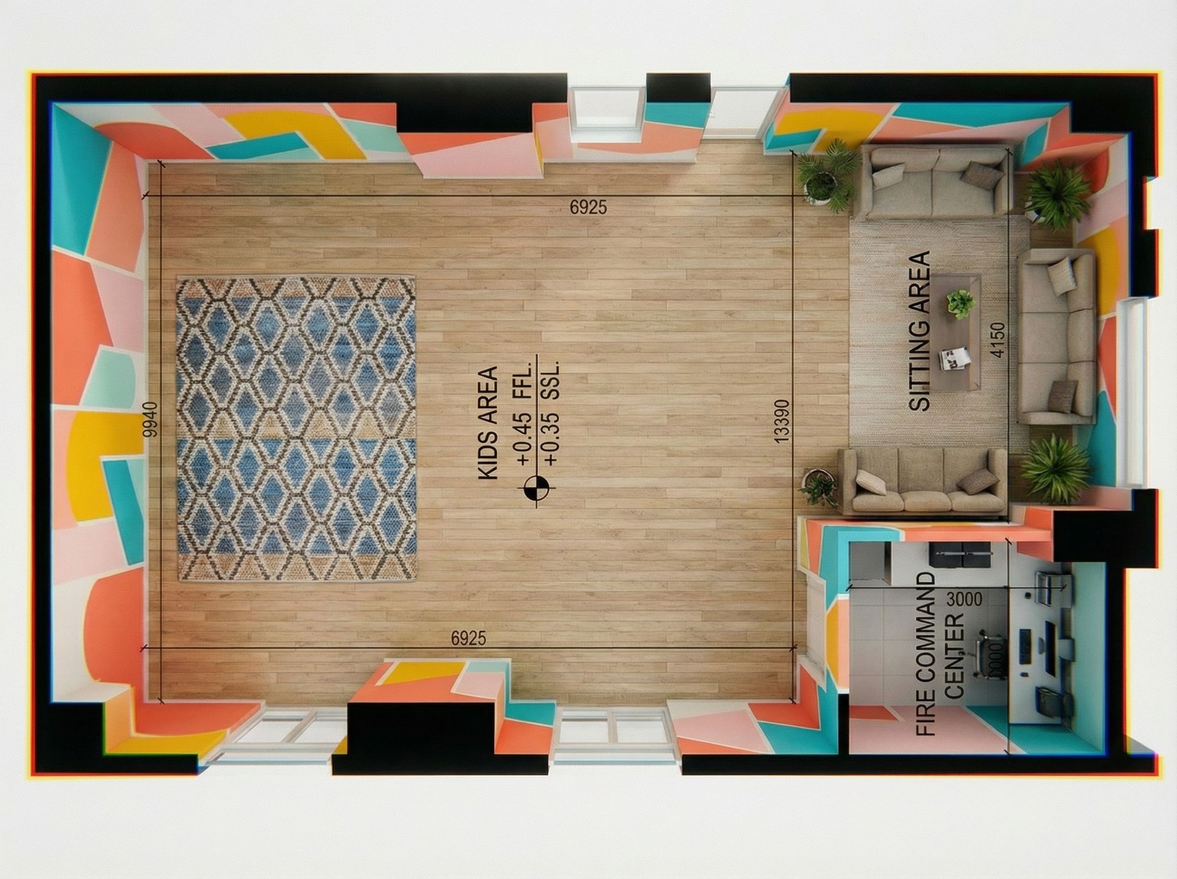 Promptmake the door in the top wall to be a window same as the one beside it , and for the two windows located in the down wall , make them up for 1000mm above the floor finish , make the render 8k resolution and enhance the quality to be extremely detailed