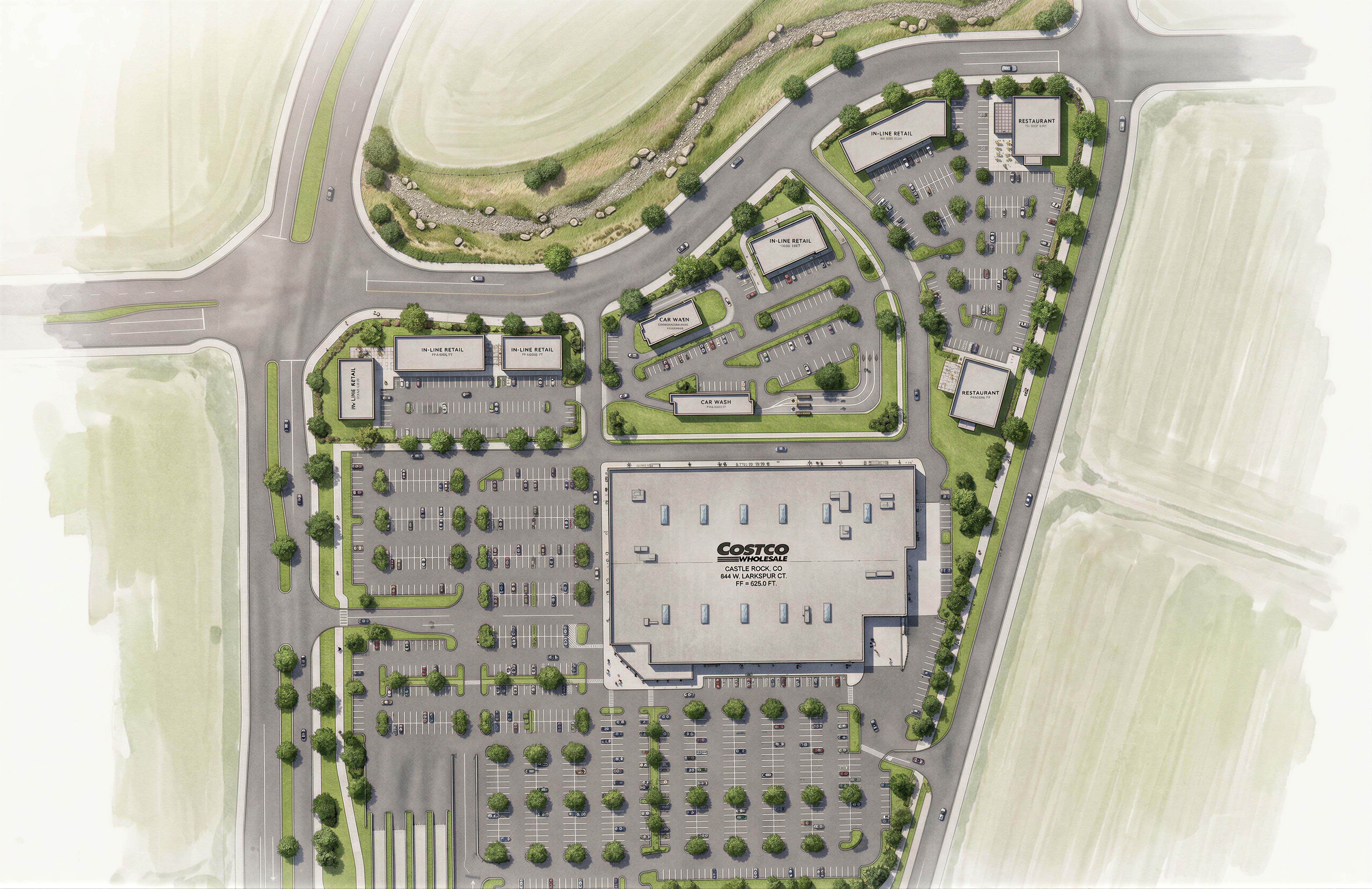 Create a high-quality, photorealistic architectural rendering of the provided site plan / master plan. IMPORTANT: Do NOT modify, redesign, reinterpret, or move any elements of the plan. Maintain the exact layout, geometry, building footprints, parking layout, drive aisles, sidewalks, landscape areas, and dimensions exactly as shown in the drawing. The rendering must strictly follow the original plan. Rendering requirements: • Convert the plan into a clean, high-resolution, colored architectural site plan rendering. • Maintain the exact scale and proportions of all elements. • Apply realistic materials and textures to buildings, pavement, sidewalks, grass, trees, and landscape areas. • Use natural color palette and realistic shading. • Add subtle realistic landscape elements such as trees, grass, shrubs, and ground cover only where landscaping is already indicated on the plan. -MAKE ROOFS FLAT -NO WATER • Render parking areas, roads, and walkways with realistic paving textures. • Add soft shadows and lighting for depth while keeping the drawing readable. • Keep all labels, markings, and layout legible if present. • Produce a professional architectural presentation style suitable for client presentation. Output: Ultra-high resolution, crisp, professional, realistic architectural site plan rendering with clean graphics and natural colors, without altering any part of the original design.