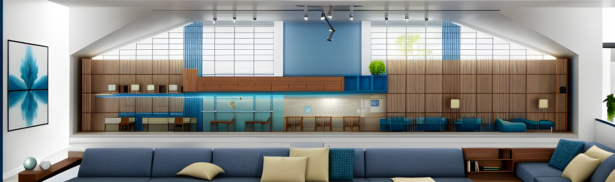 Prompt4k quality section in two-dimensional form for a lounge for teachers the strips in the back are blue glass. the top of every section is glass. it is not a perspective. the last bottom section is not an entertainment case. it is not a house. it is a section for plans.