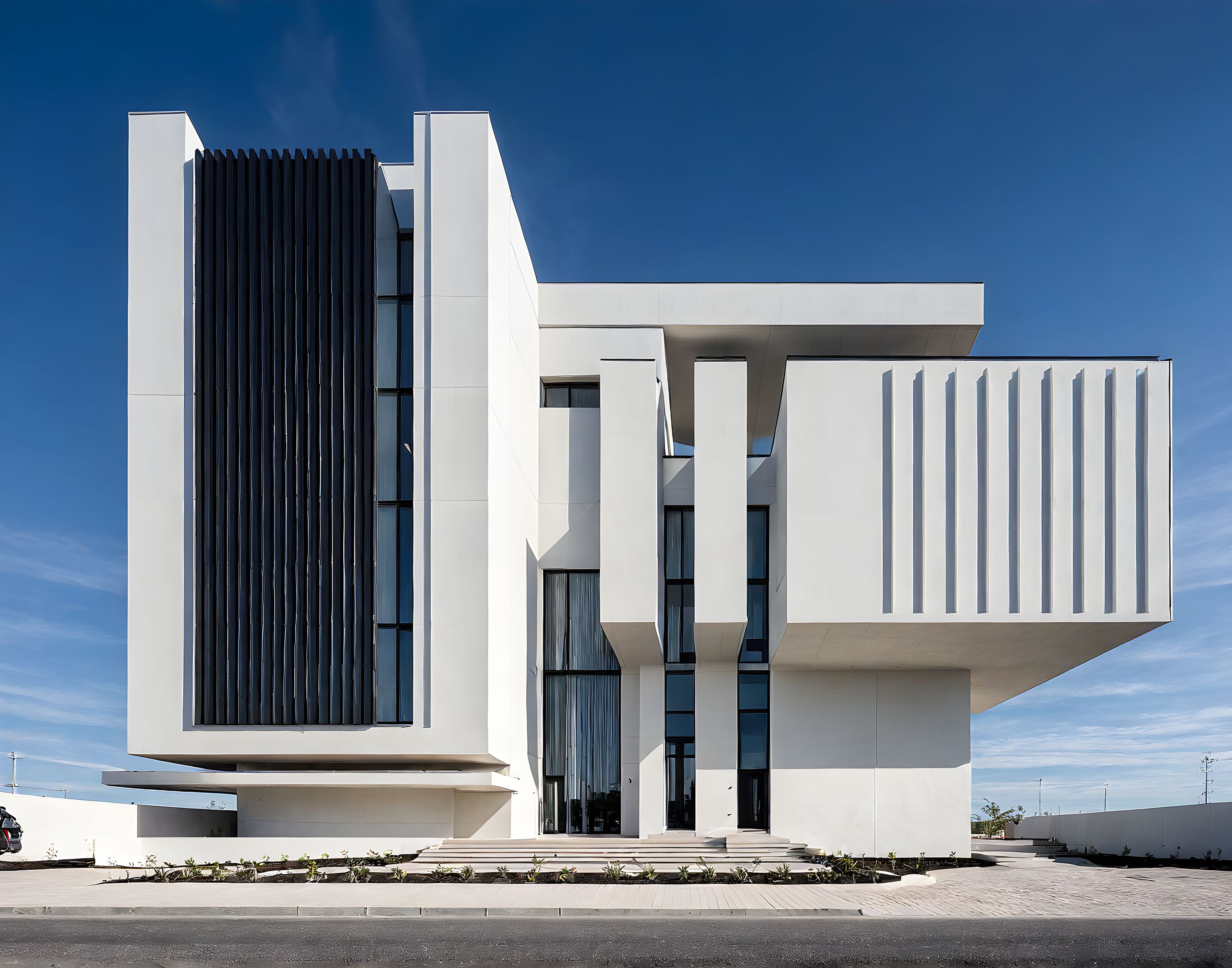 PromptPhoto of a modern residential building with a prominent geometric design, featuring clean lines and a combination of white and black textures. Architectural elements include expansive curtain glazing, vertical slats for visual interest, and cantilevered sections. The urban setting includes a landscaped front area, with a stylish car parked nearby. The scene is set during the day, with bright natural light casting soft shadows across the façade. Captured from a low angle perspective, the framing emphasizes the structure's height and unique architectural contours, showcasing lifelike qualities of materials and surroundings.