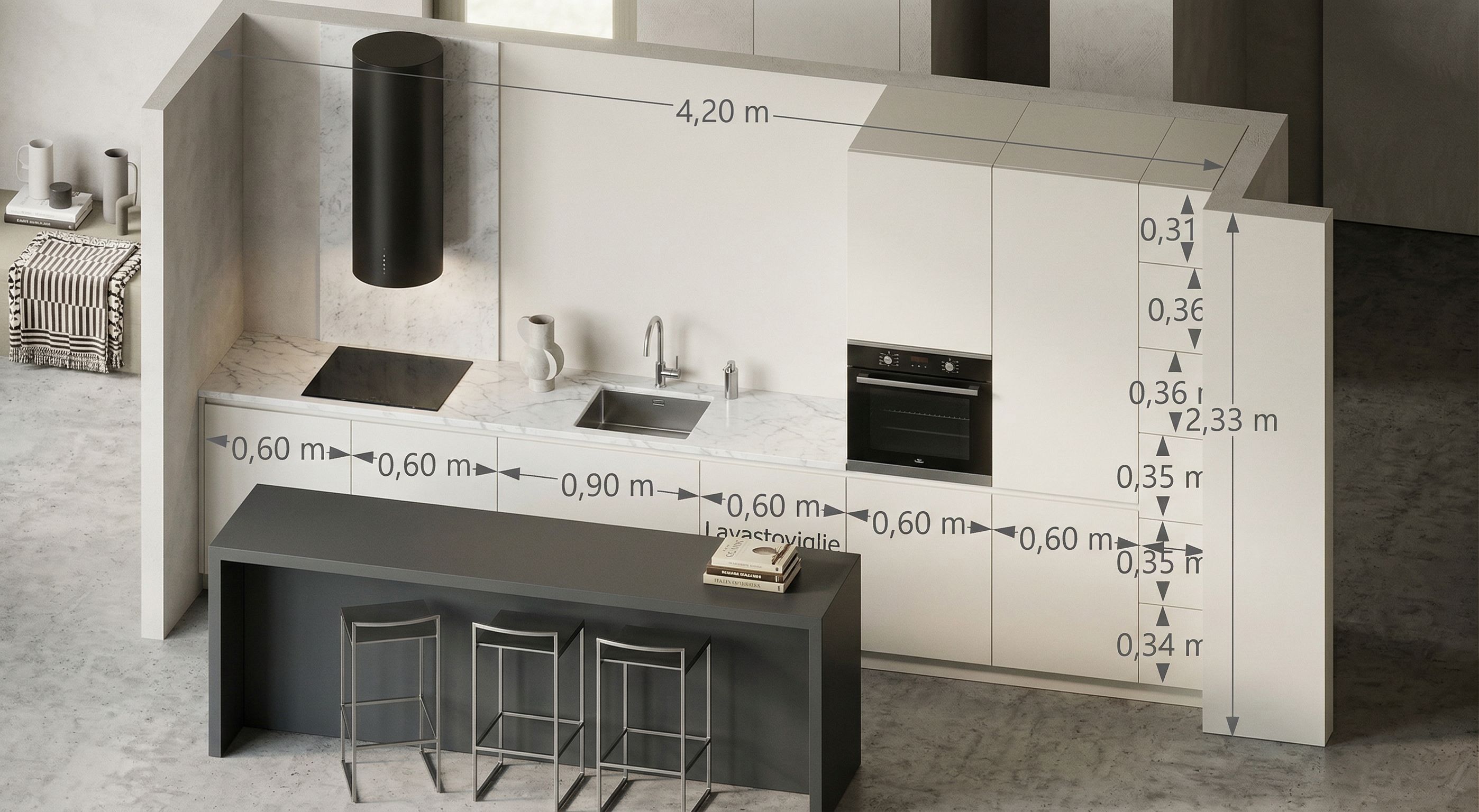 PromptModern minimalist kitchen design with a clean, monolithic aesthetic. The kitchen features full-height cabinetry designed as completely closed parallelepiped volumes, with no visible handles or openings, creating a seamless and compact wall. All columns are fully closed (no glass), with a smooth and uniform finish. Use Carrara marble for the countertop, with elegant white tones and subtle gray veining. Above the cooking area, place a round matte black range hood as a sculptural focal point. Include a fully enclosed kitchen island, closed on all sides, with a solid block appearance, finished in dark gray RAL 7024. The overall style should be contemporary and architectural, with soft lighting, high-end materials, neutral tones, and a highly realistic, photorealistic rendering., keep exact camera angle