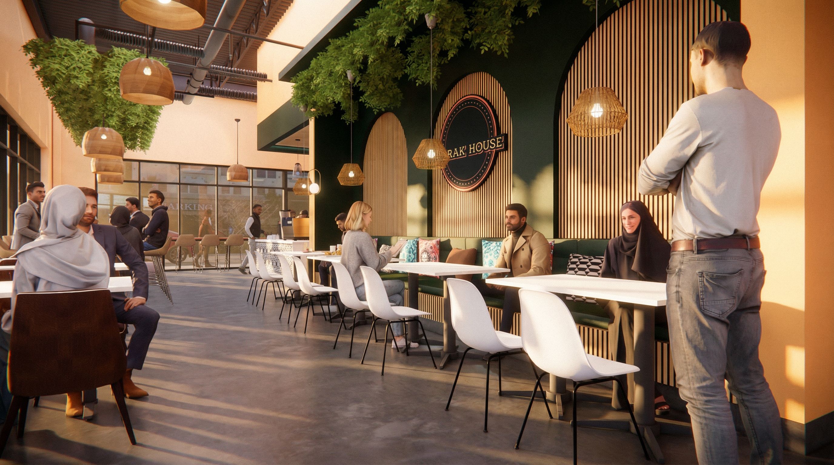 PromptPhoto of a contemporary cafe interior, showcasing sleek furniture with minimalist design elements. The space features wooden accents, hanging pendant lights, and lush greenery integrated into the design. Surrounded by large glass windows, the atmosphere is bright and inviting, with soft, natural light illuminating the patrons' faces. The camera captures a mid-angle perspective, emphasizing the spacious layout, with a wide lens that highlights the depth and interaction among customers. Shadows play softly against the modern textures of the concrete floor and wooden surfaces, creating a warm, engaging environment., keep exact camera angle