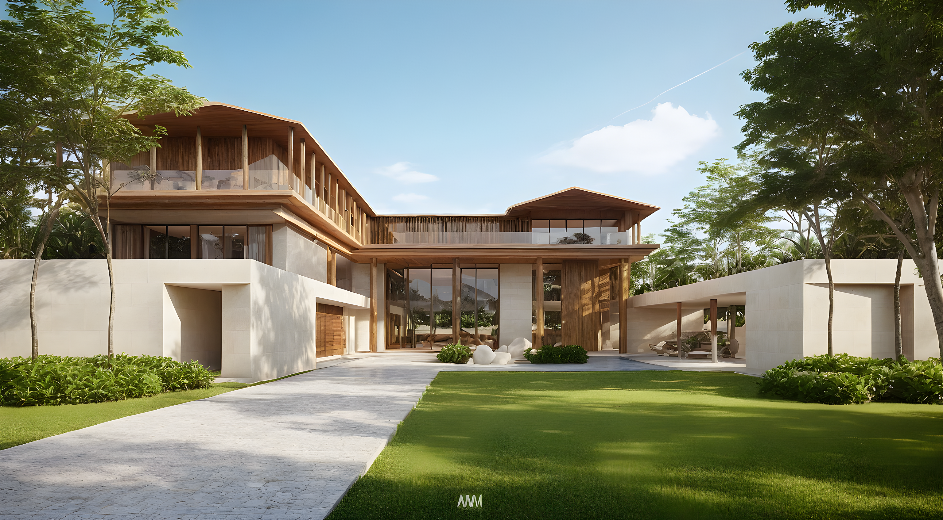 bright day vibrant environment minimal design teak lumber teak column smooth beige limestone tropical garden with grass lawn