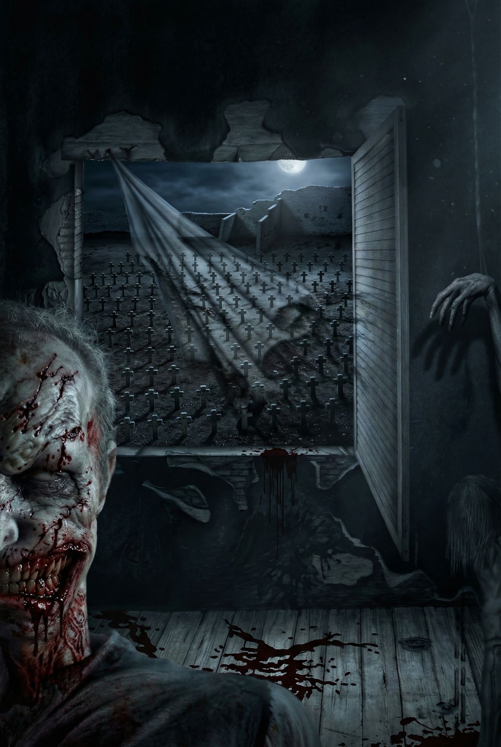architectural exterior rendering, render this 3D mass into photorealistic rendering, interior design rendering, render this drawing into photorealistic rendering, Create a realistic horror scene. There Is lot of Blood. Atmosphere Is scared., keep exact camera angle, night scene with ambient lighting, high quality, professional, detailed scene, keep exact camera angle, night scene with ambient lighting, high quality, professional, detailed scene