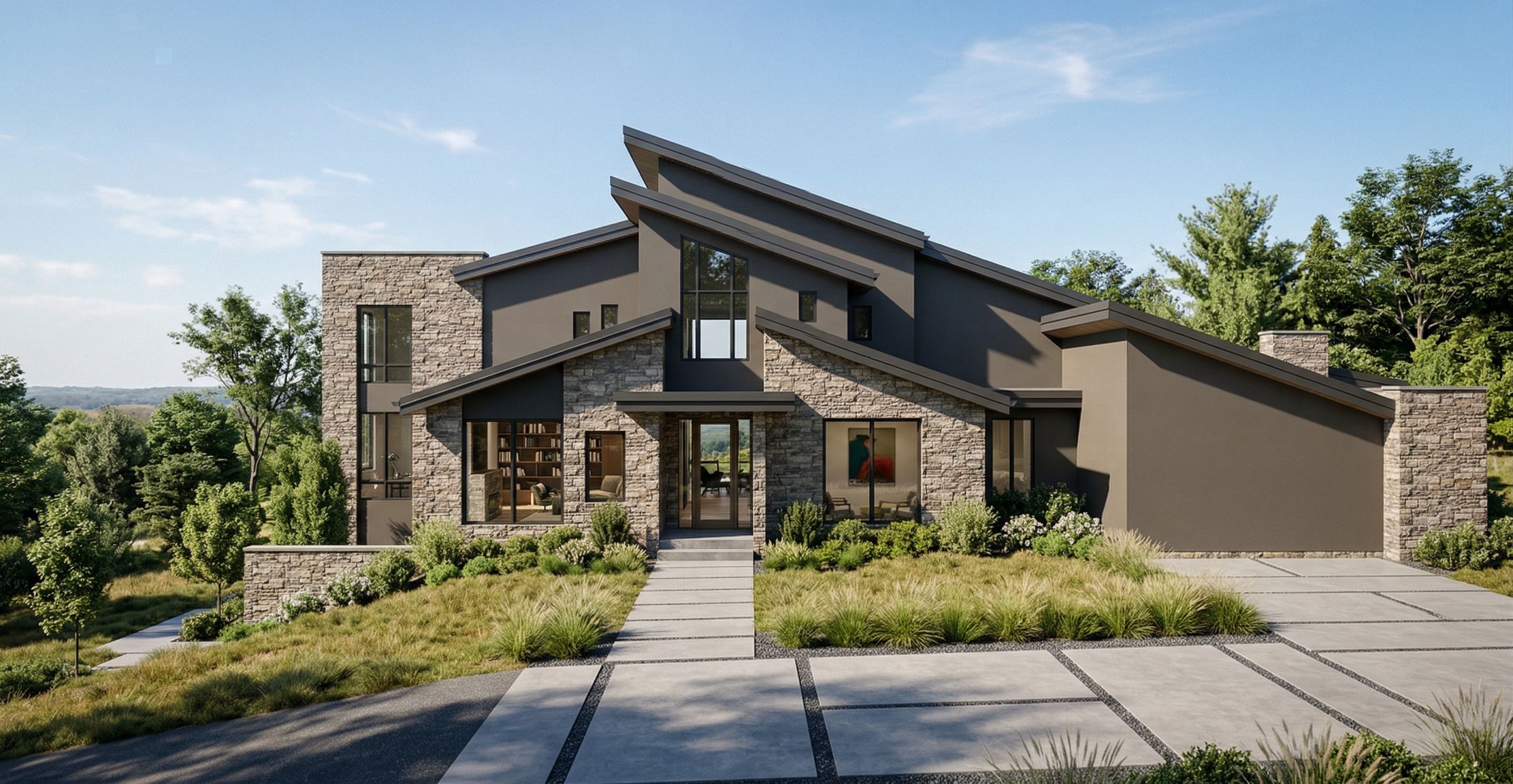 Promptcreate a rendering with painted siding. add a front walkway and driveway., keep exact camera angle